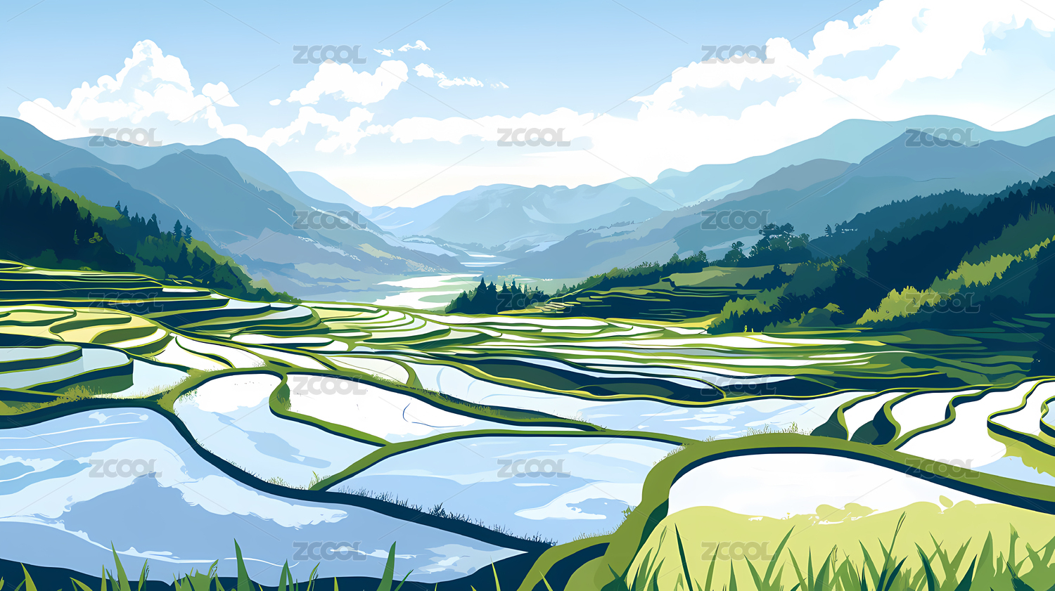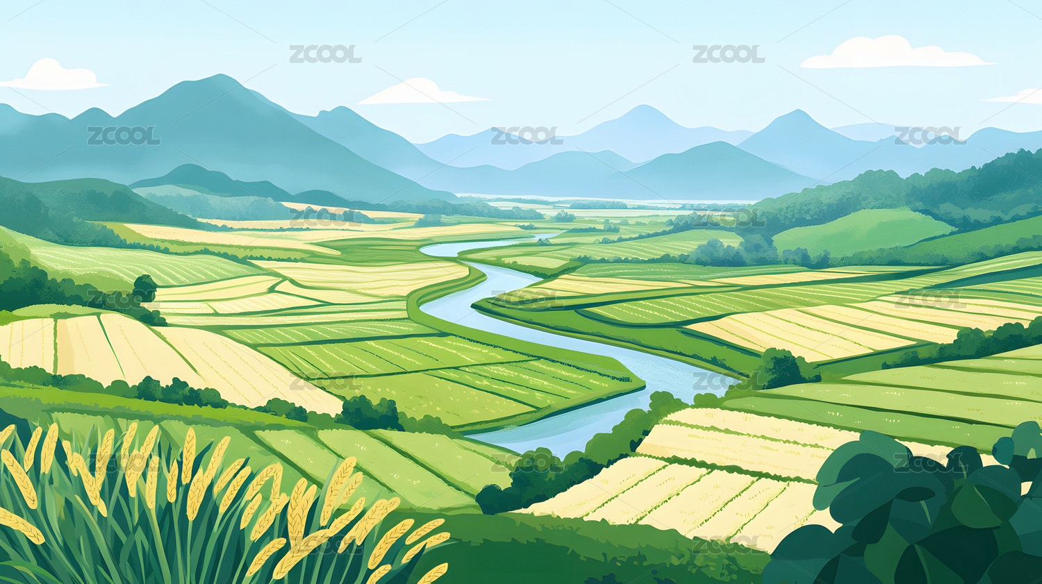 艺术,绘画,美丽,插画,和平,自然,绿色,山谷,河流,风景