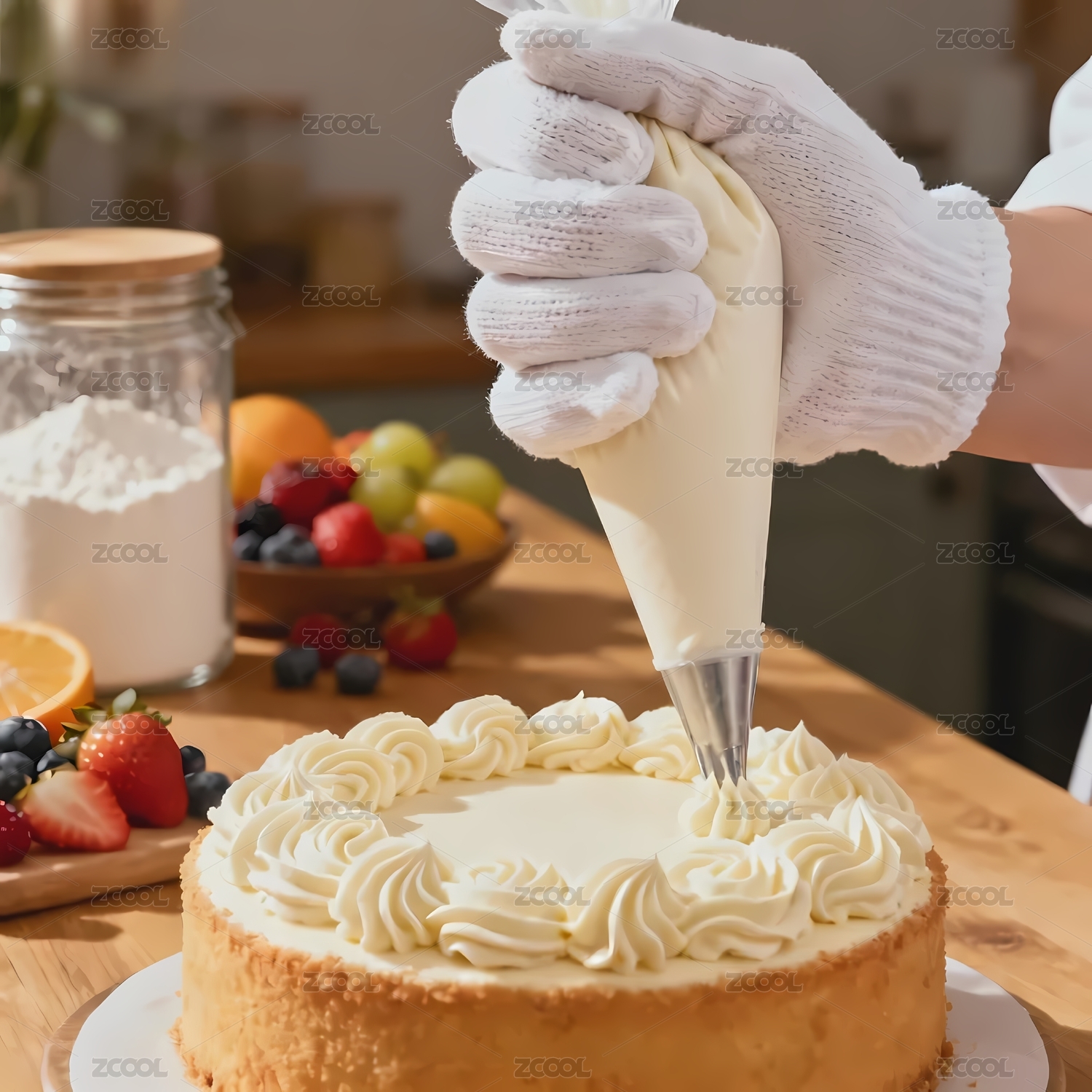 手戴手套挤奶油装饰蛋糕