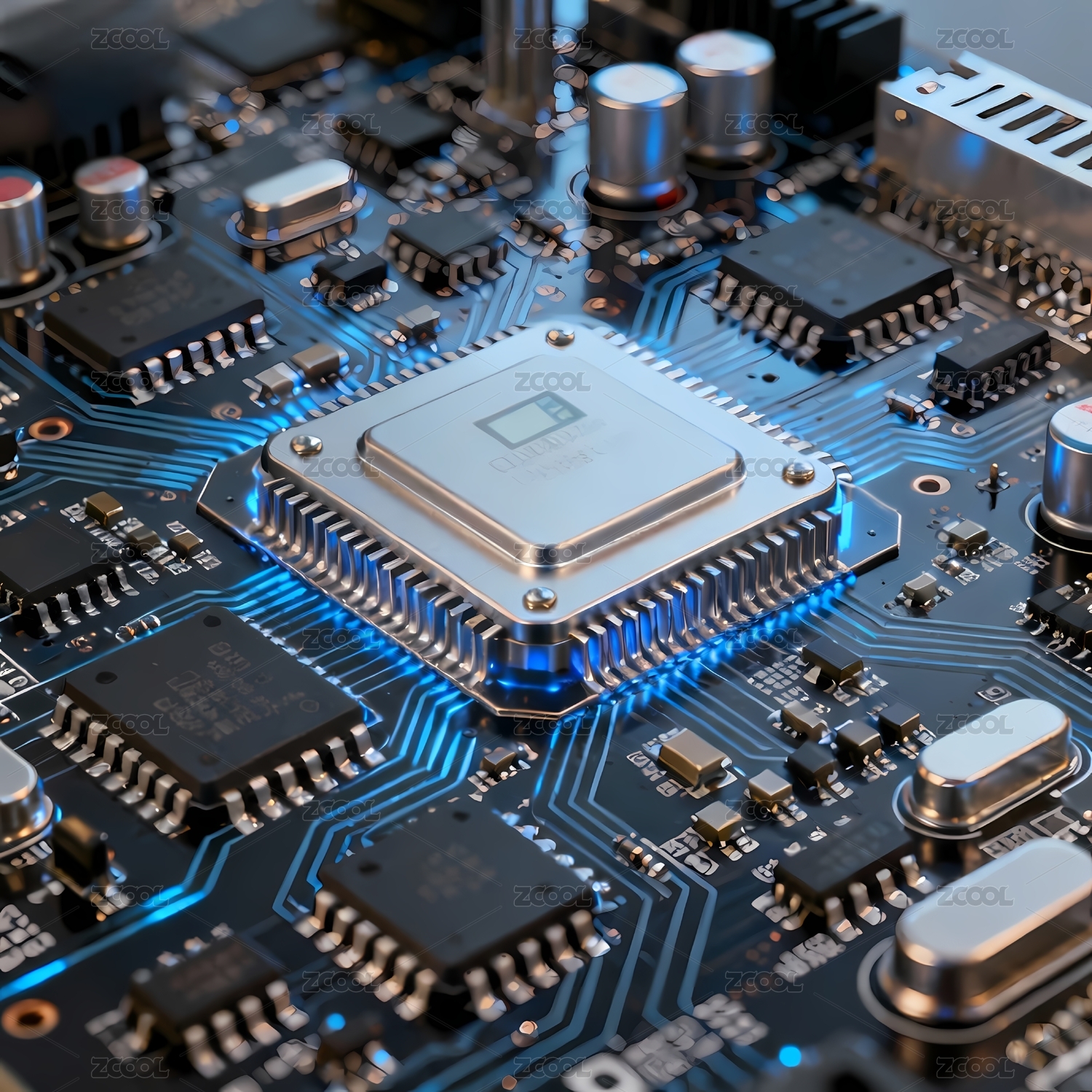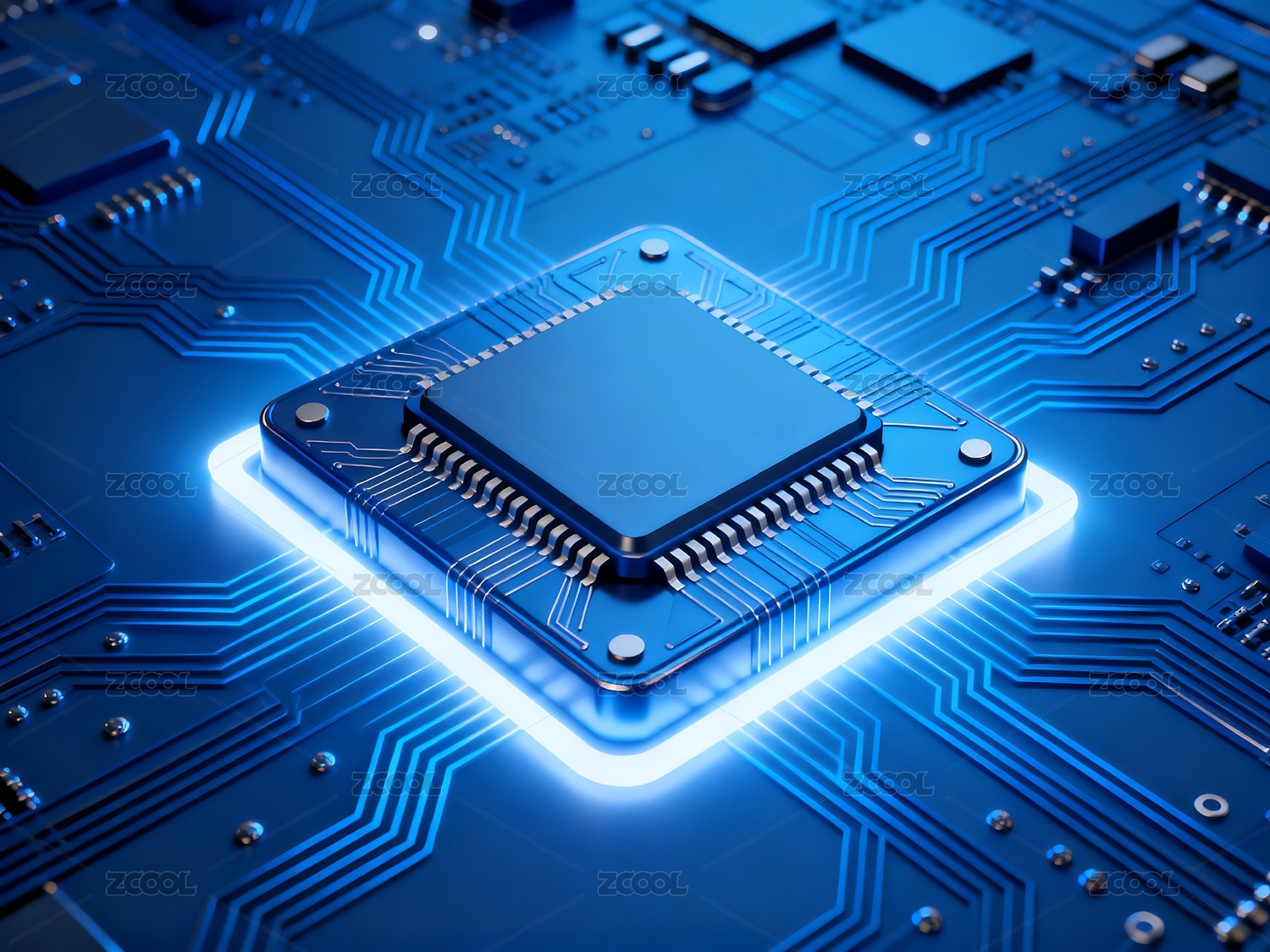 蓝色发光的电路板与芯片