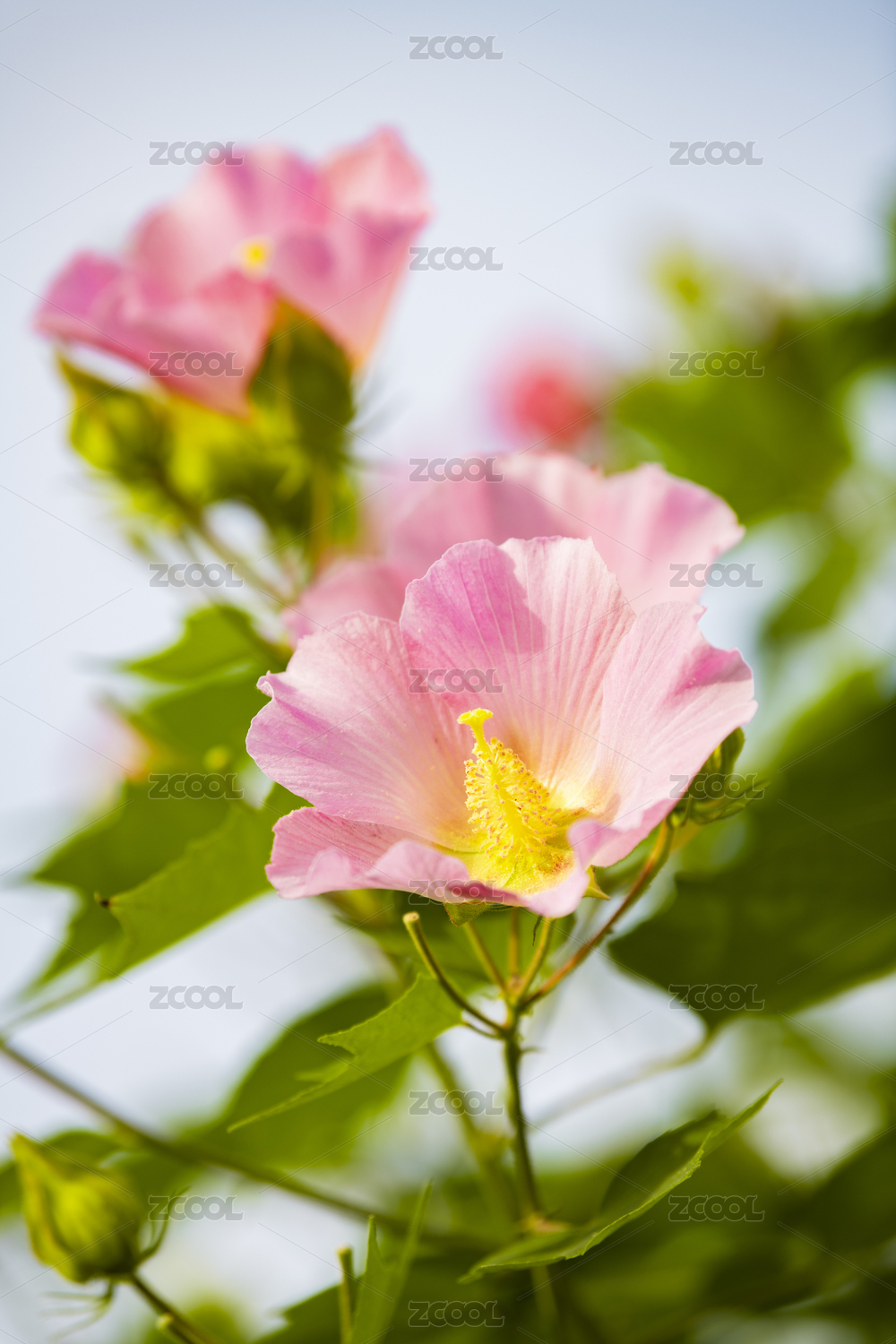 傍晚逆光环境下木芙蓉的叶子花朵和花苞