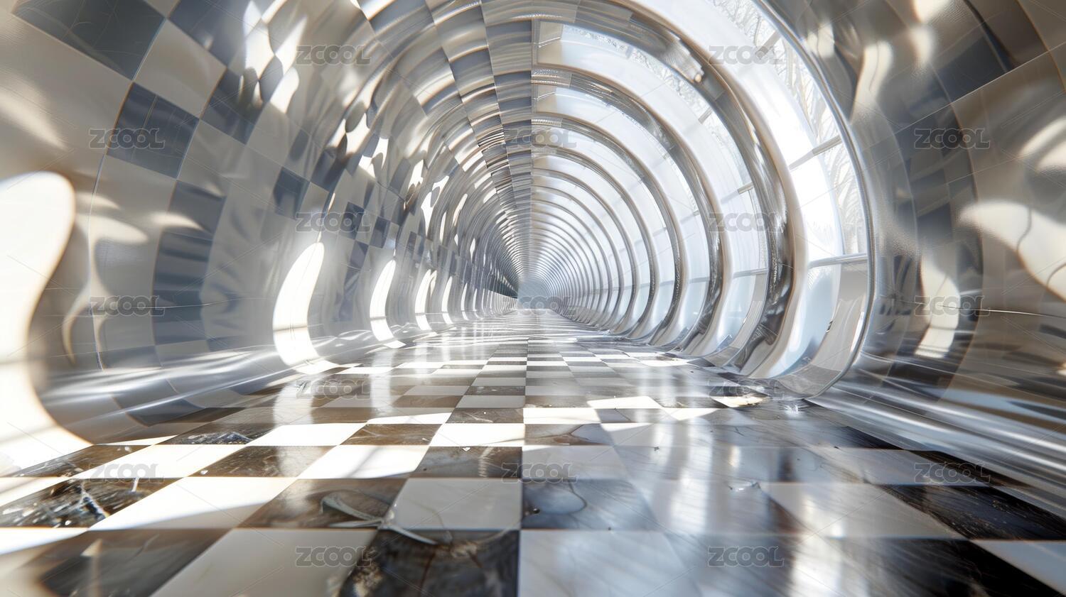 未来感隧道:反射墙壁与棋盘格地板