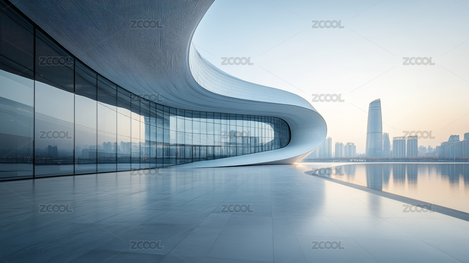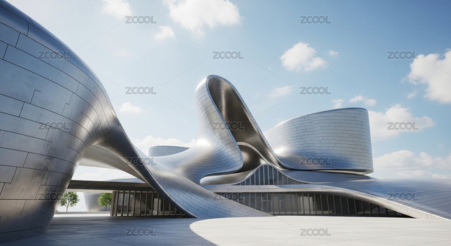 具有曲线金属表面和玻璃元素的现代建筑设计