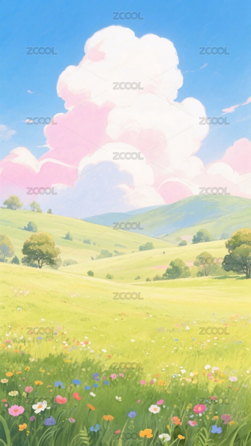 草原天空粉色云朵花海