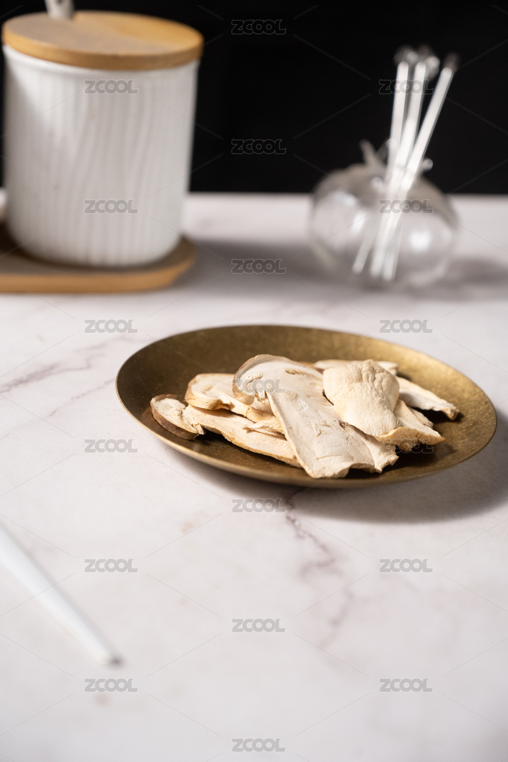 桌面上的盘子里的美味可口的干松茸