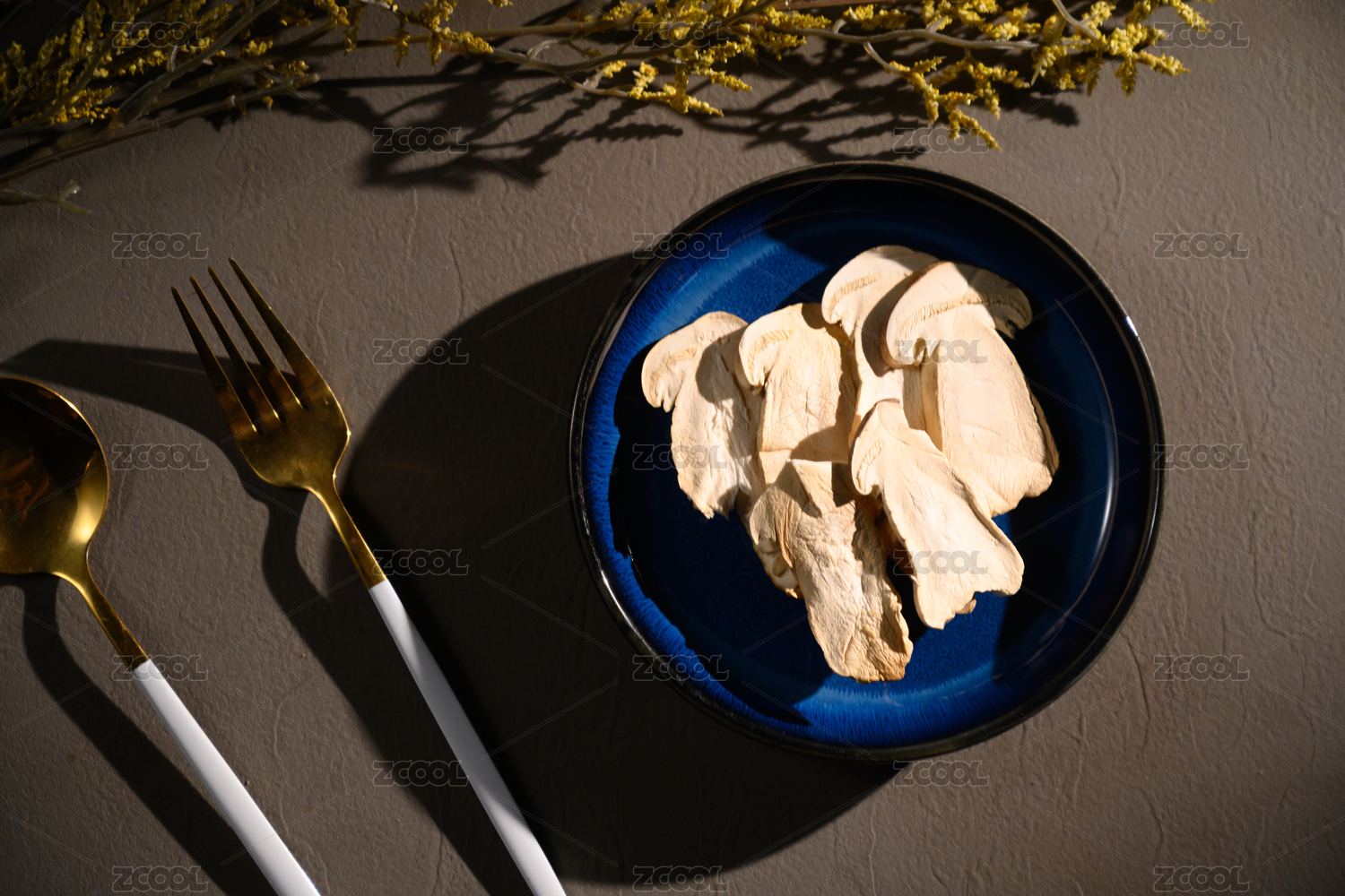 桌面上的盘子里的美味可口的干松茸