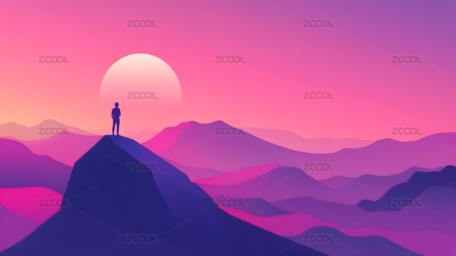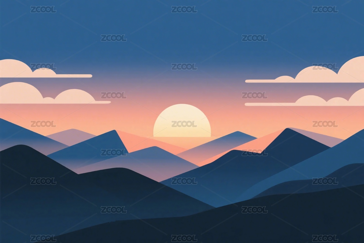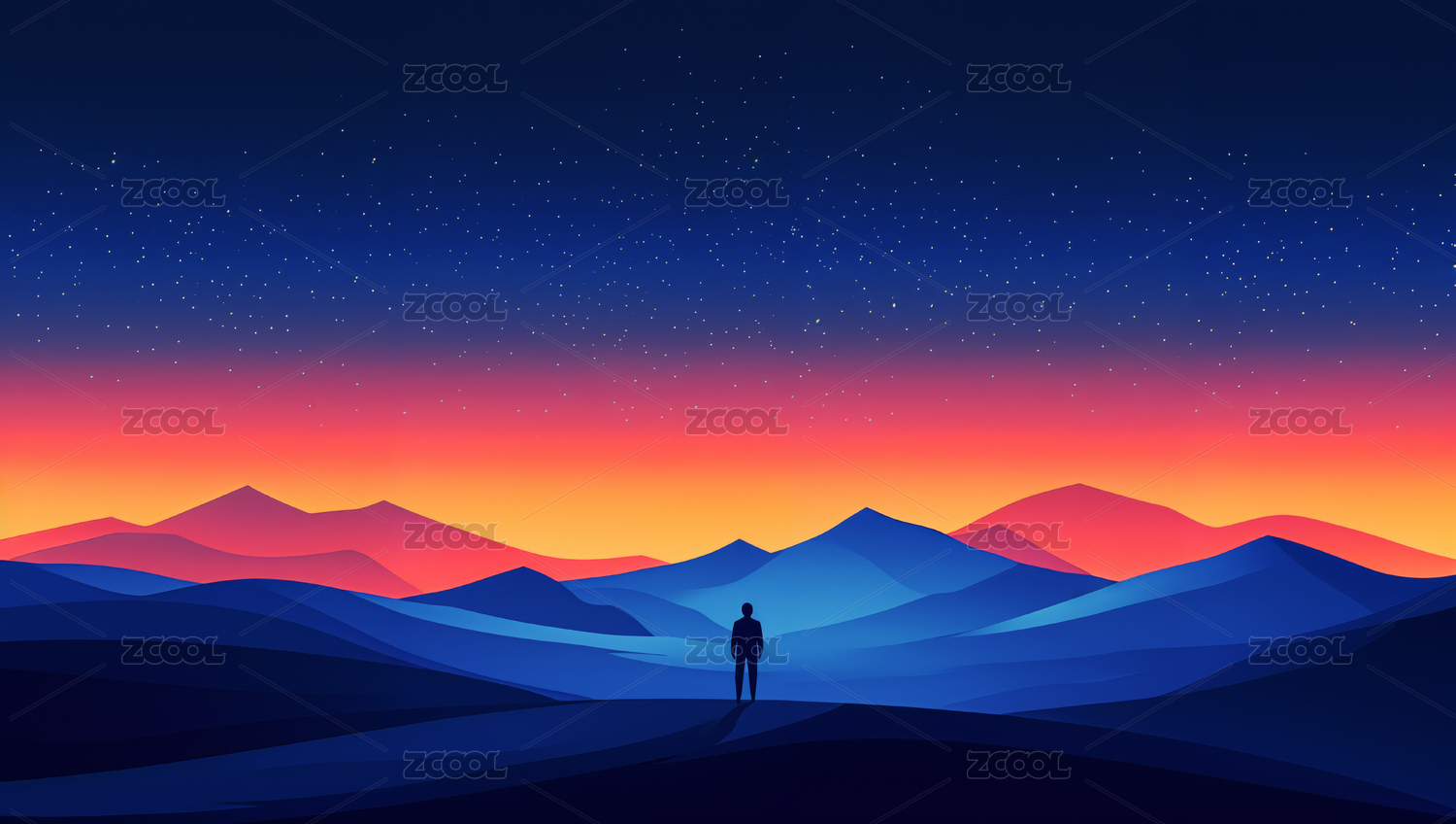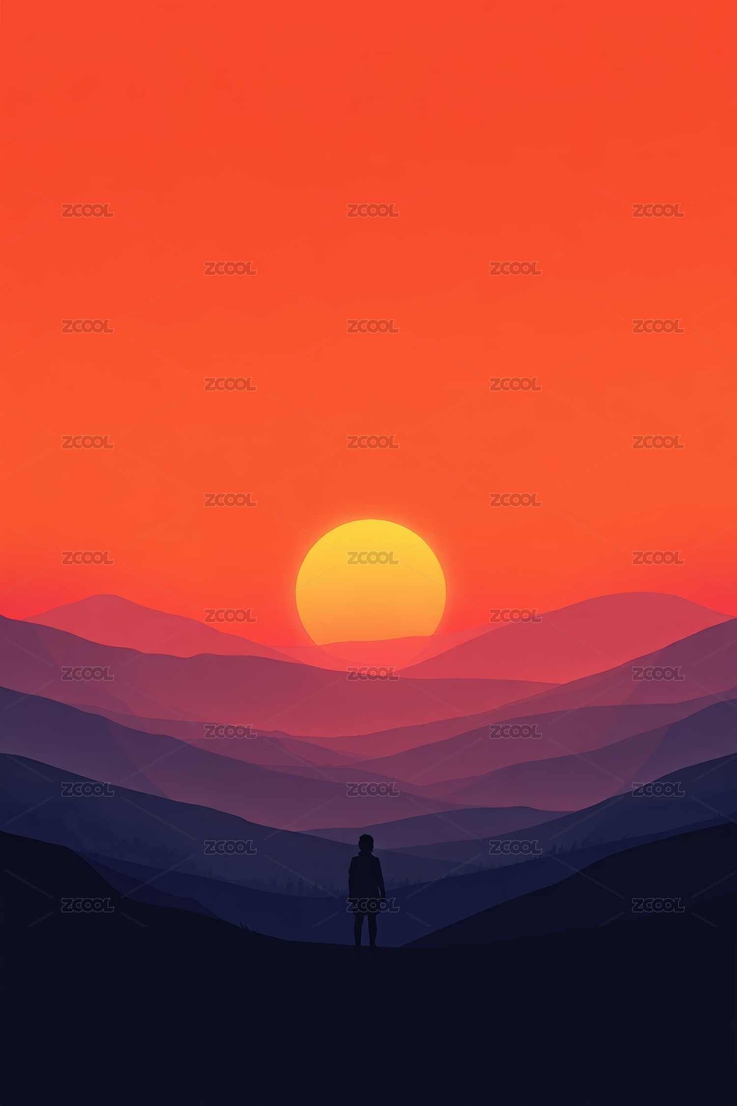 山间日落的孤独剪影 橙色天空下的静谧山景