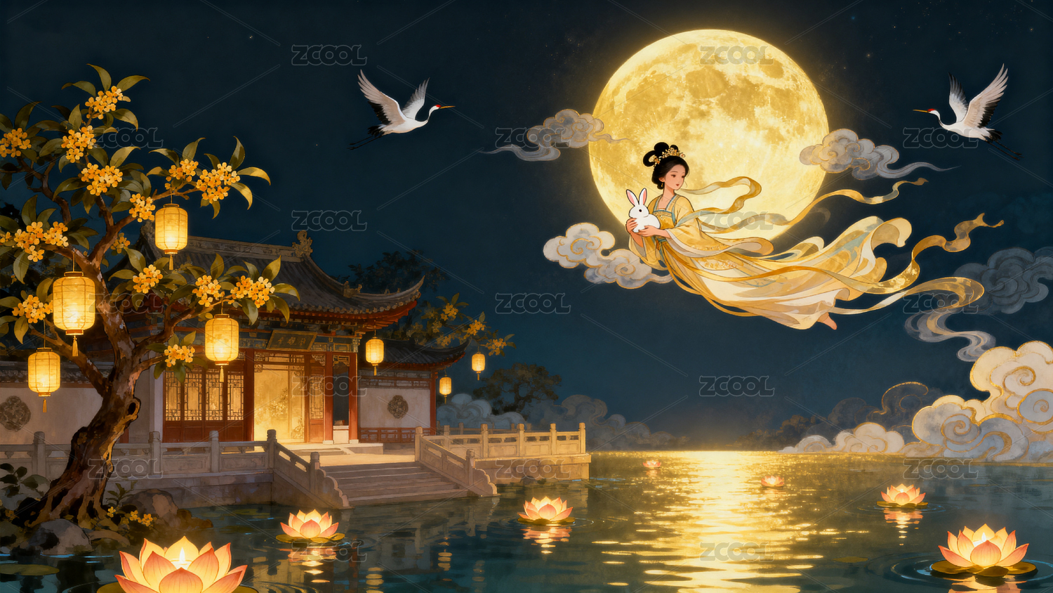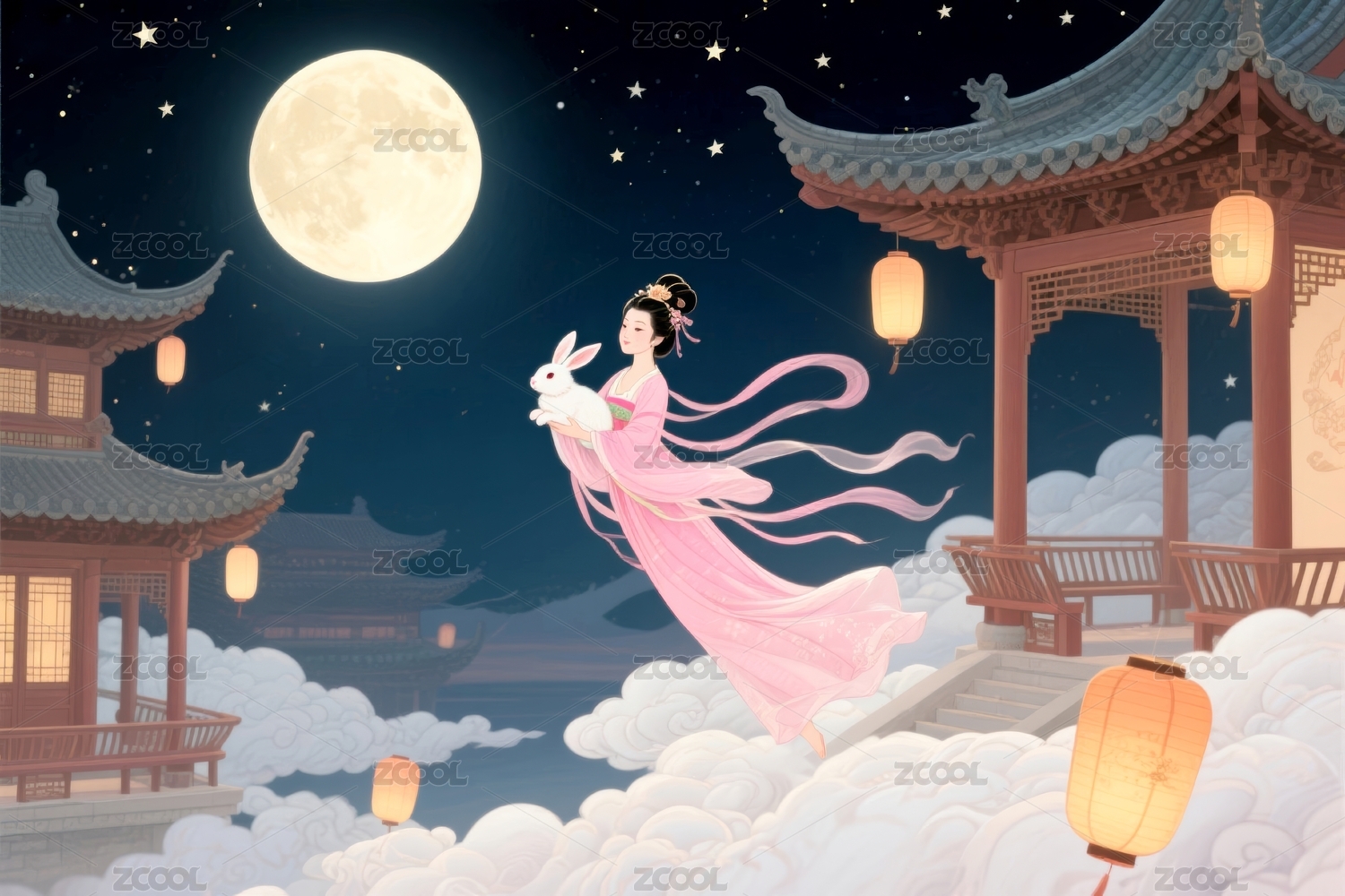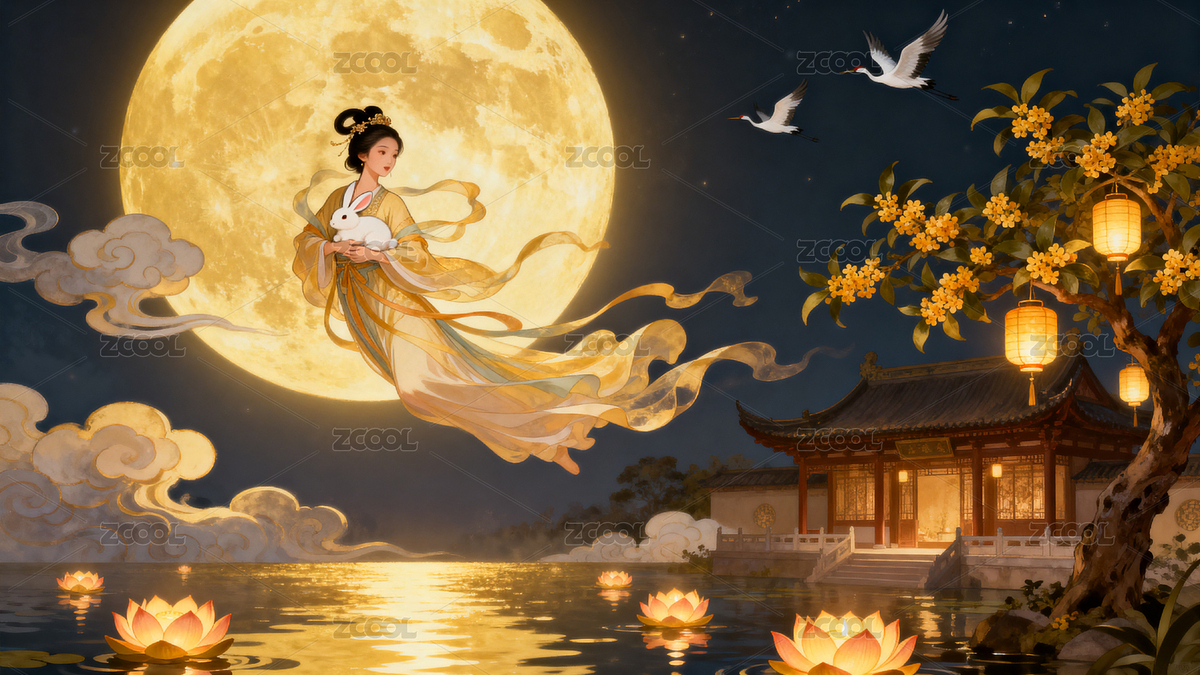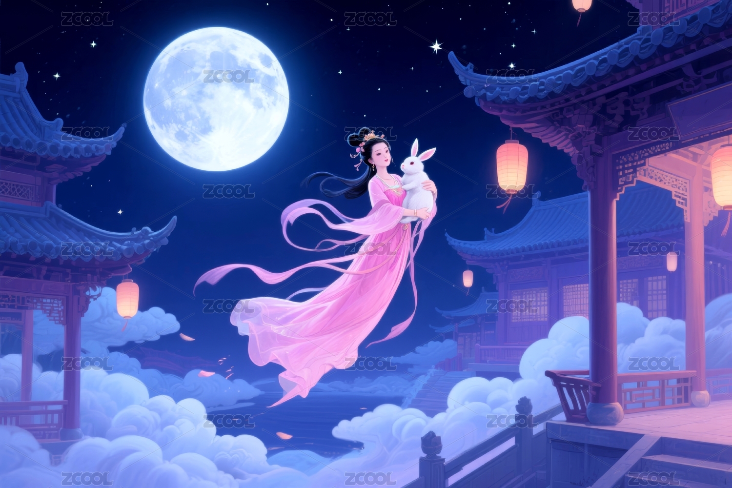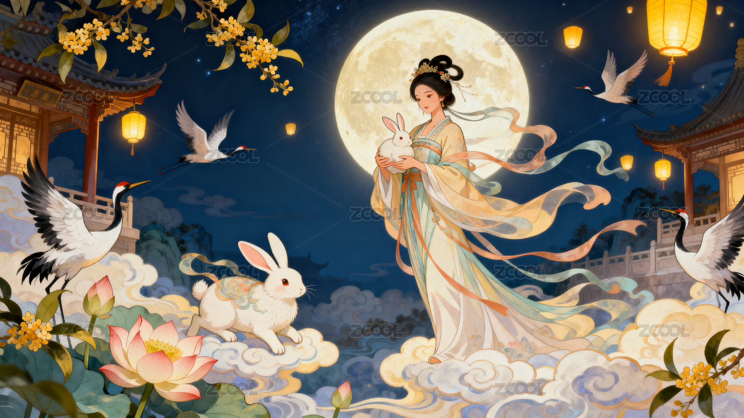 云,传统,建筑,灯笼,夜景,嫦娥,月亮,兔子,仙鹤,荷花