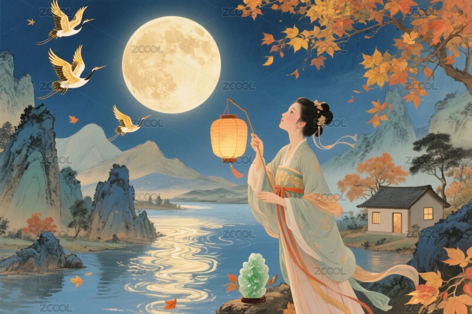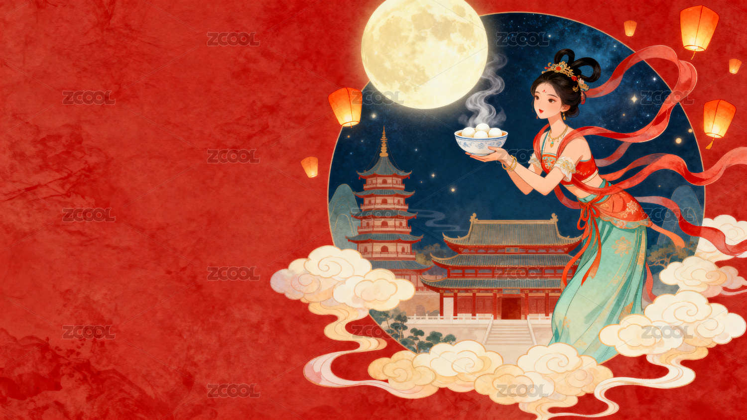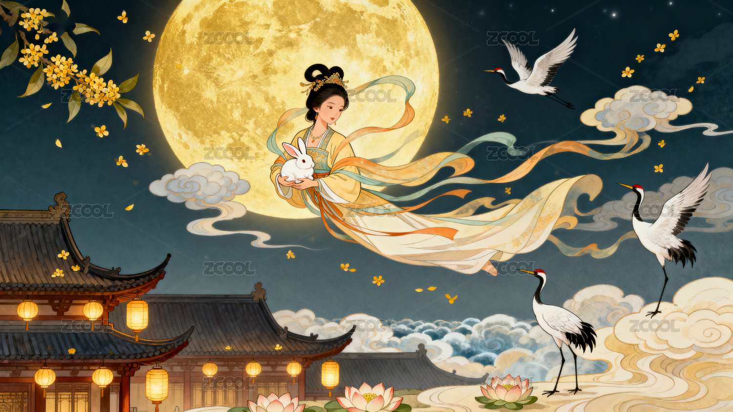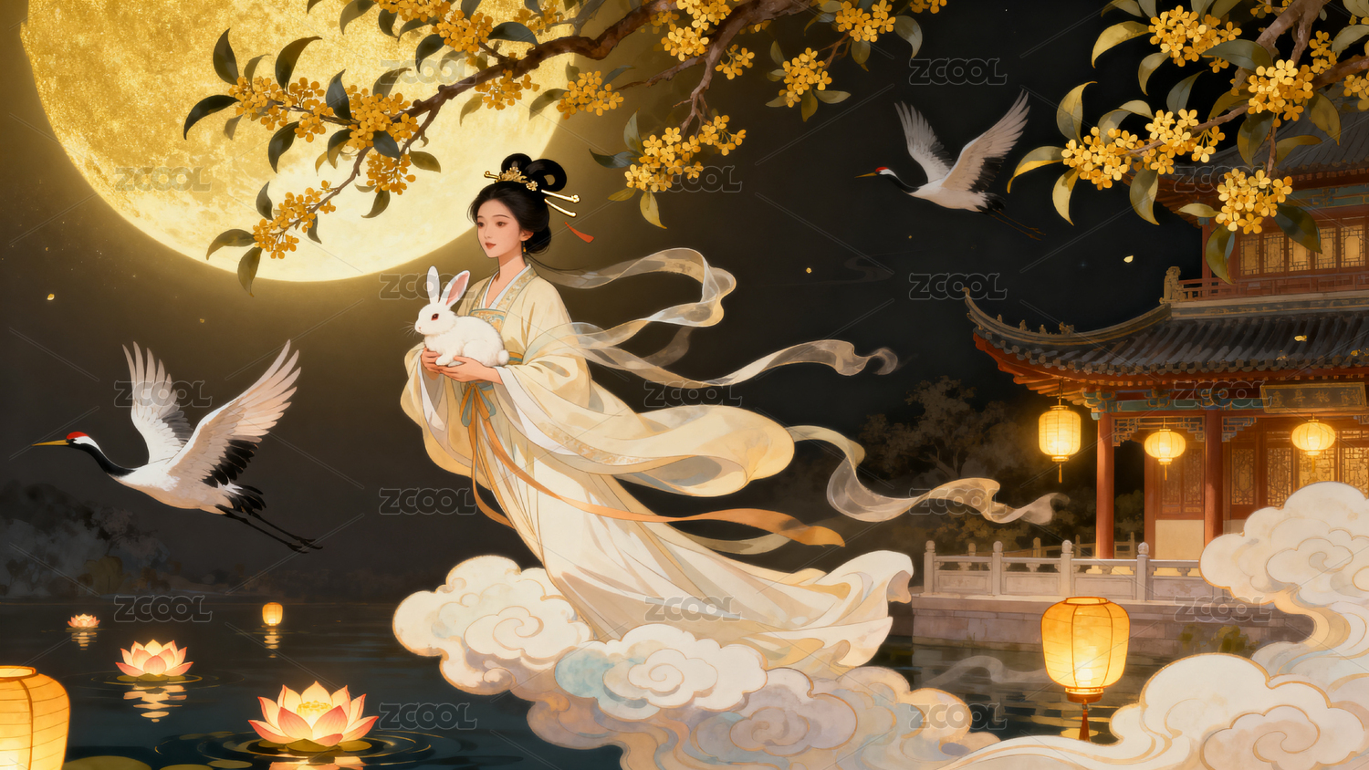 云,传统,建筑,灯笼,夜景,嫦娥,月亮,兔子,仙鹤,荷花