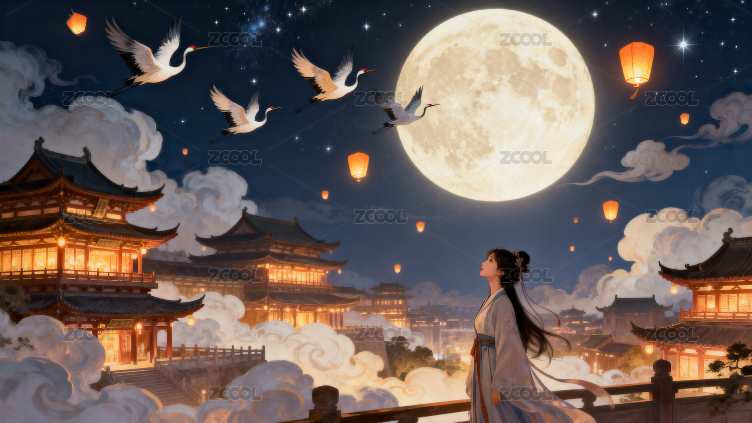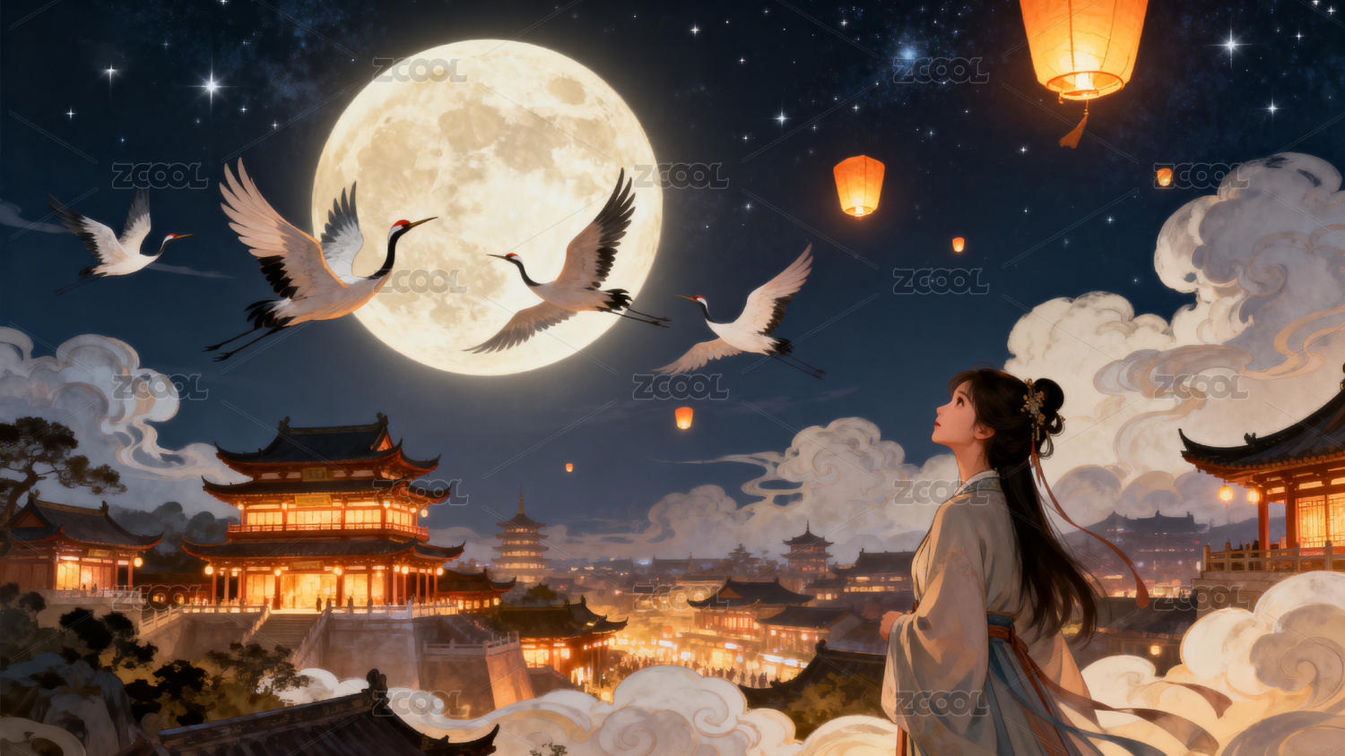 月下古建筑仙鹤飞舞女子仰望