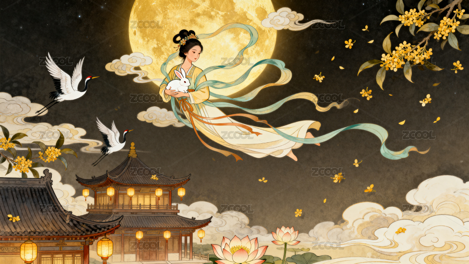 月下仙女怀抱玉兔仙鹤飞翔