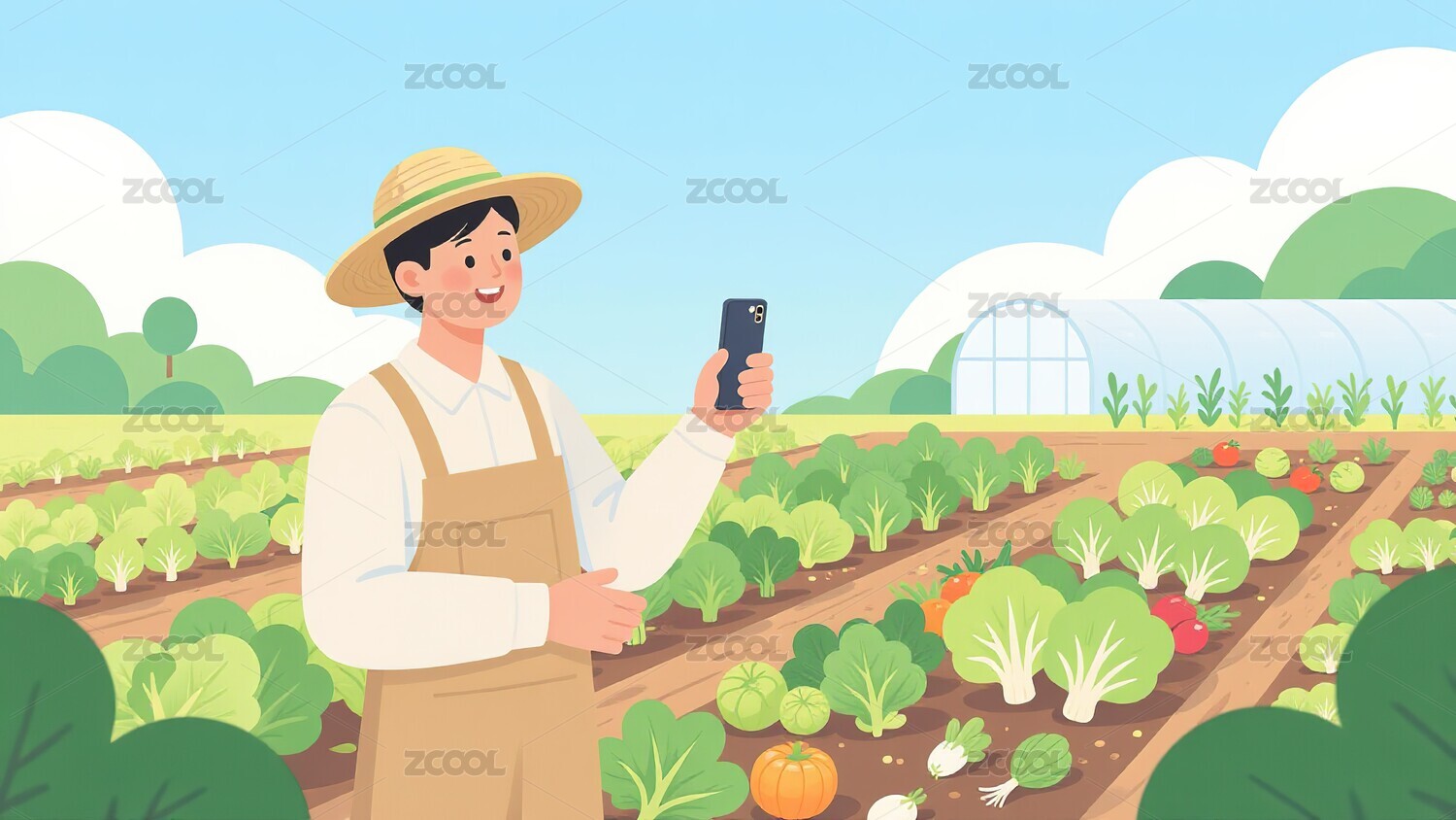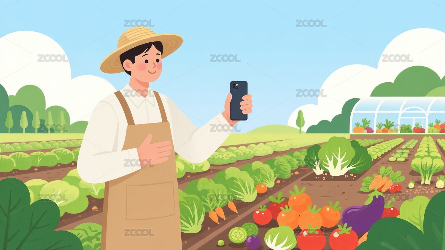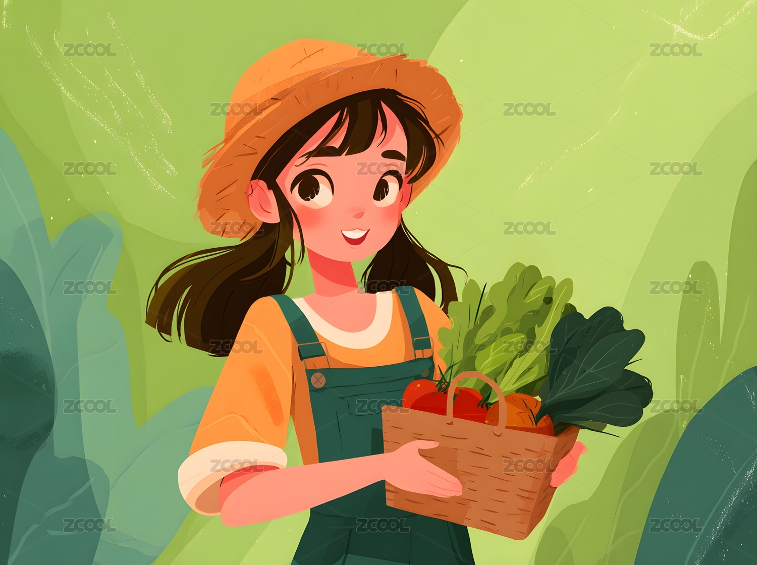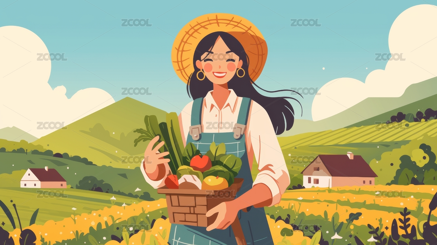 农民开心抱着丰收的果蔬篮子田园乡村农业