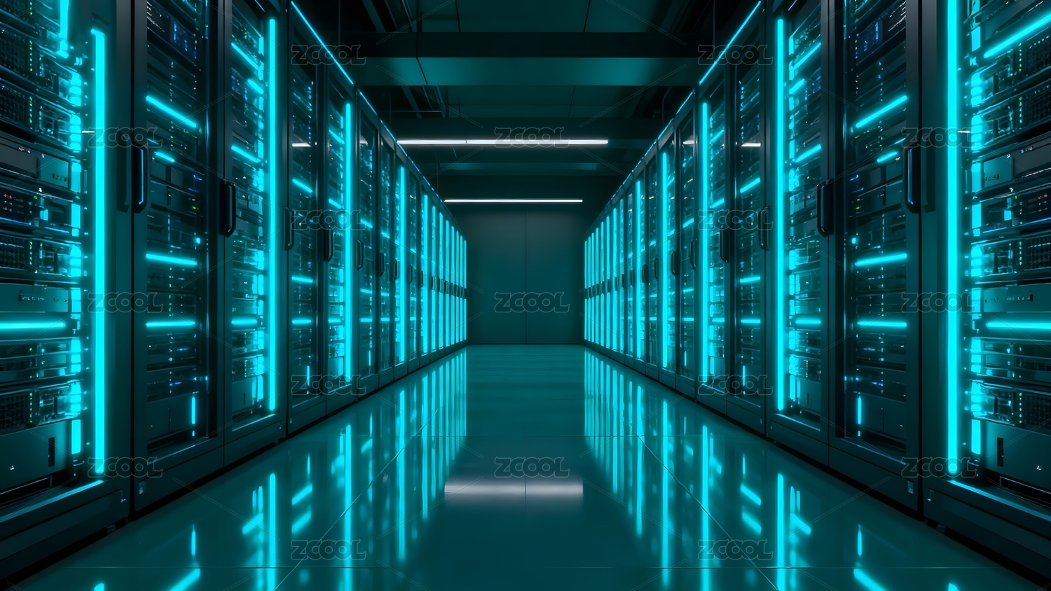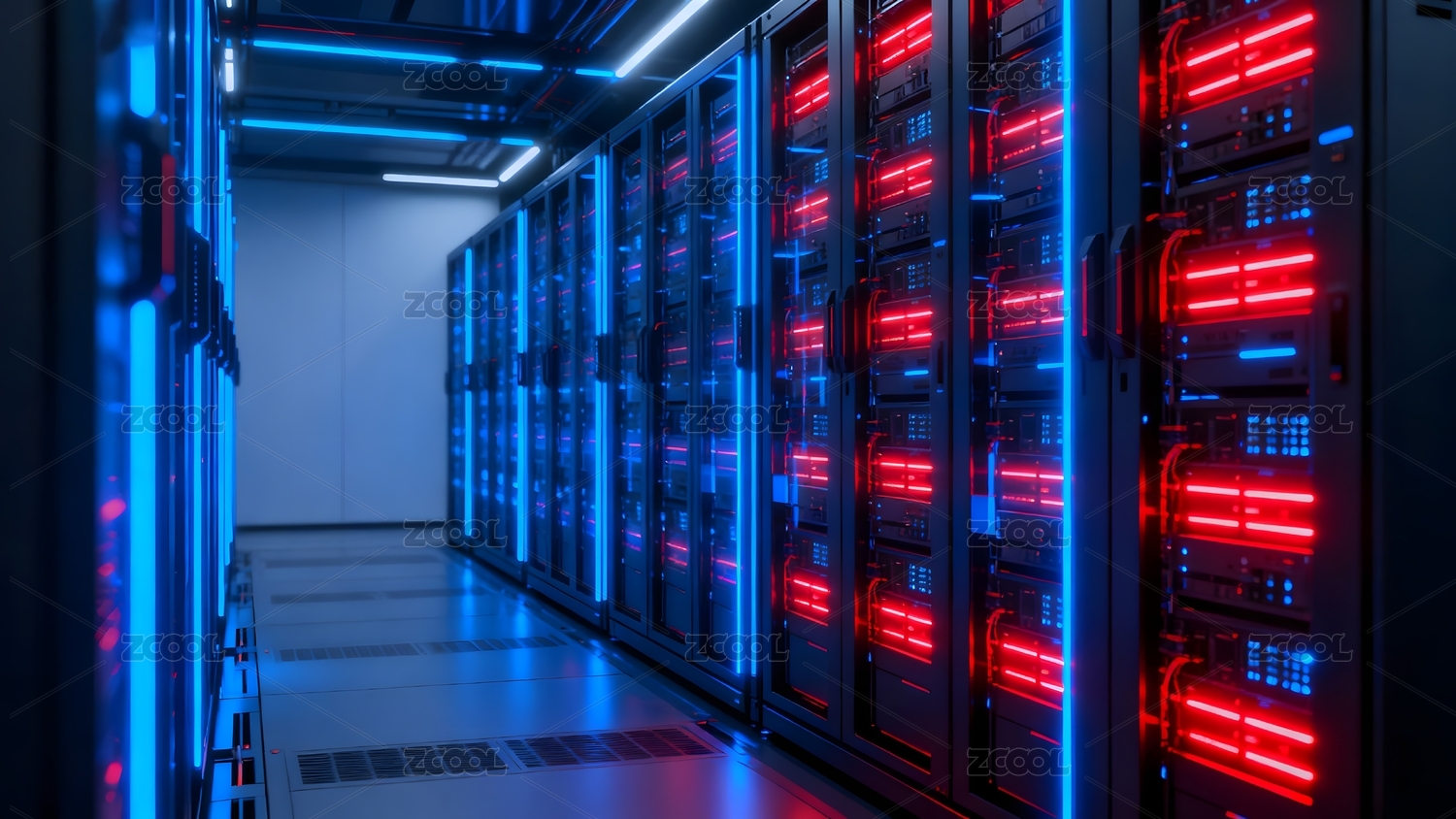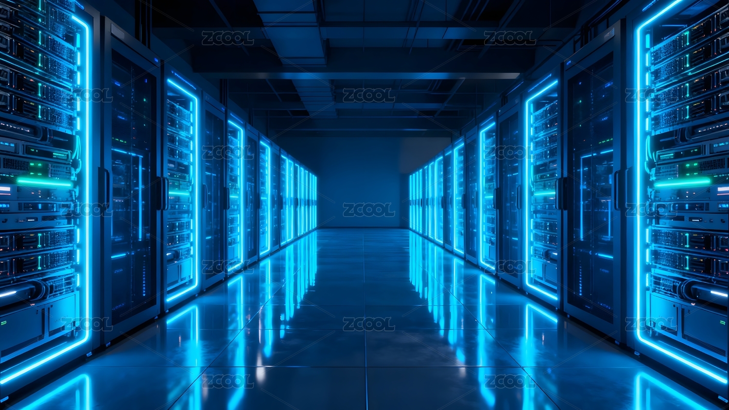 蓝色霓虹灯照亮的服务器机房走廊