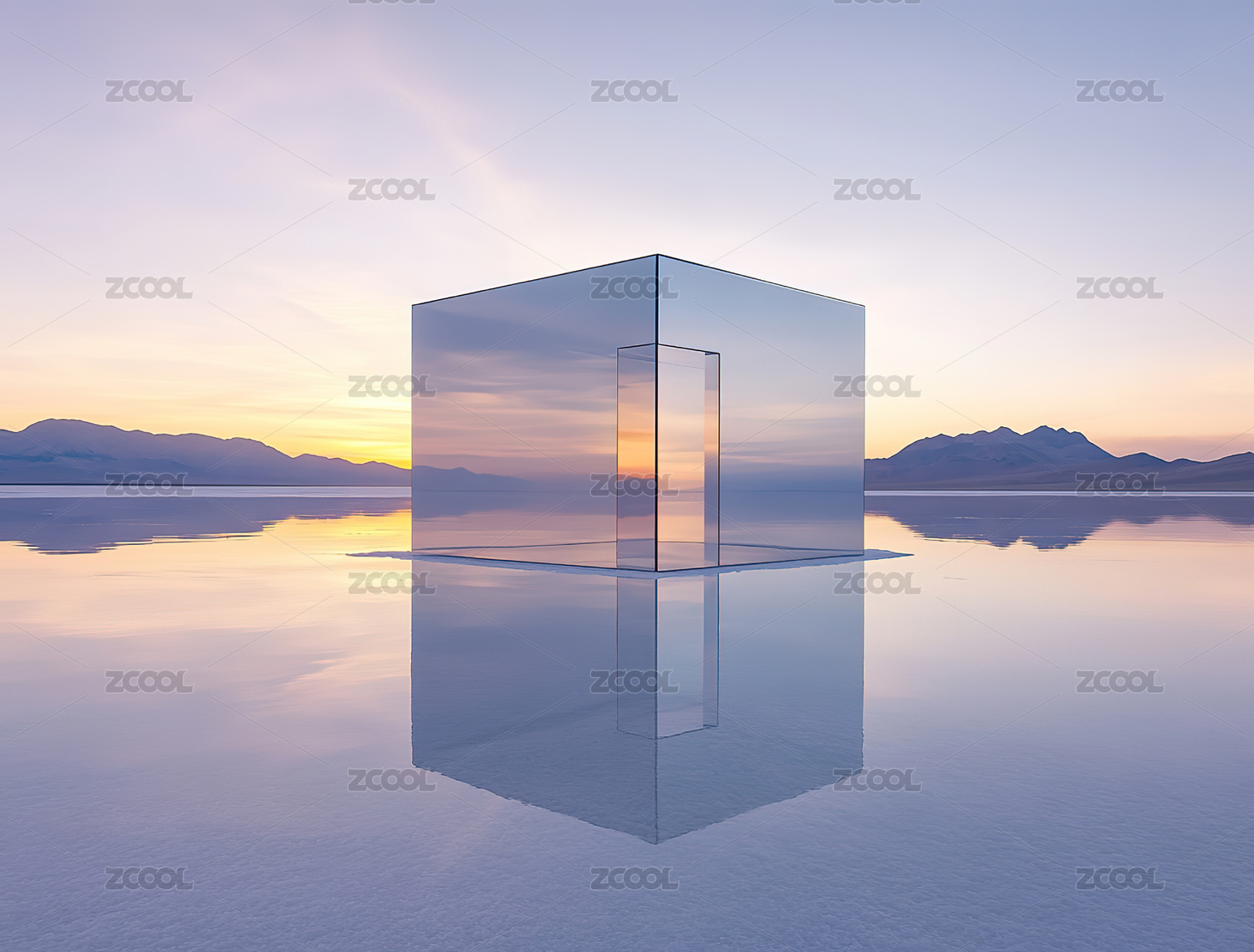 干涸湖面倒映透明立方体的黄昏景象