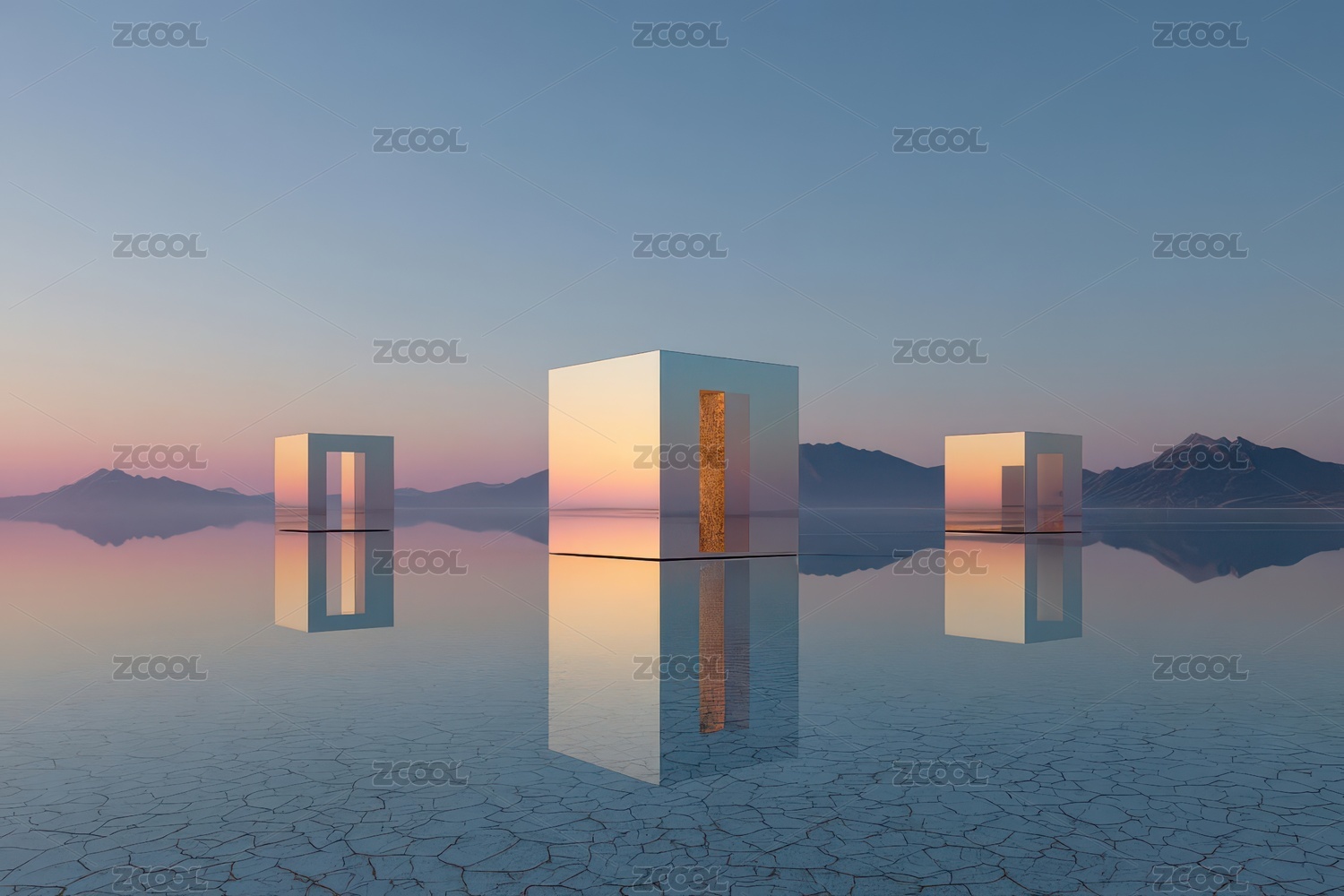 三座镜面立方体矗立于干裂湖面的黄昏景象