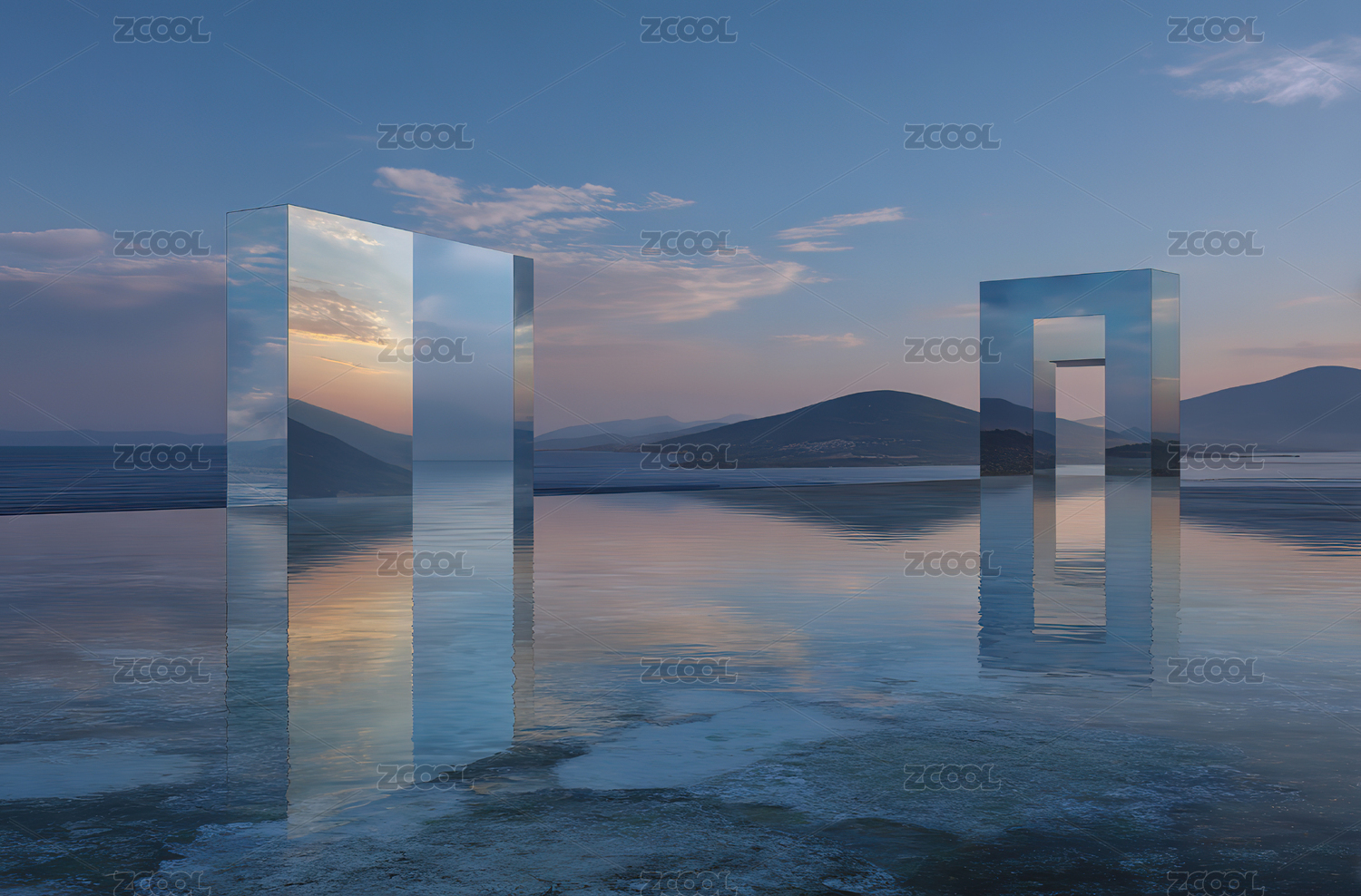 湖面镜面立方体的超现实黄昏景象