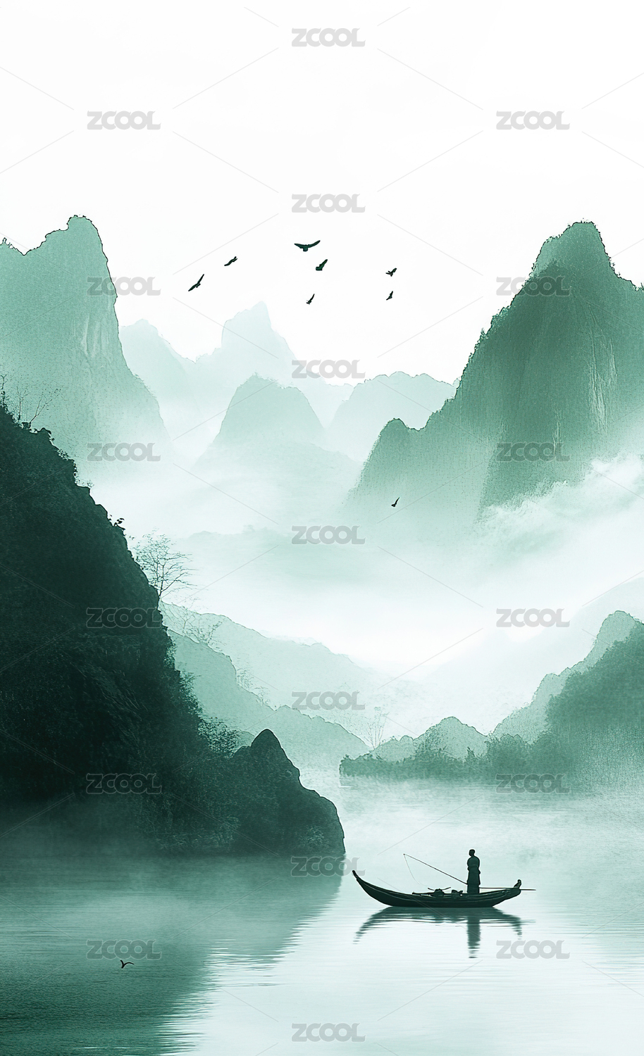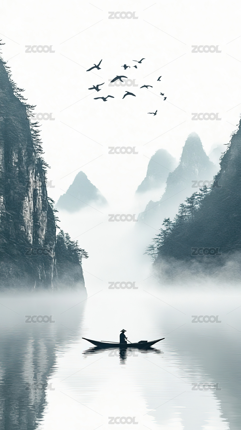 倒影,静谧,远山,水墨,竹叶,飞鸟,薄雾,小舟,渔夫,江面