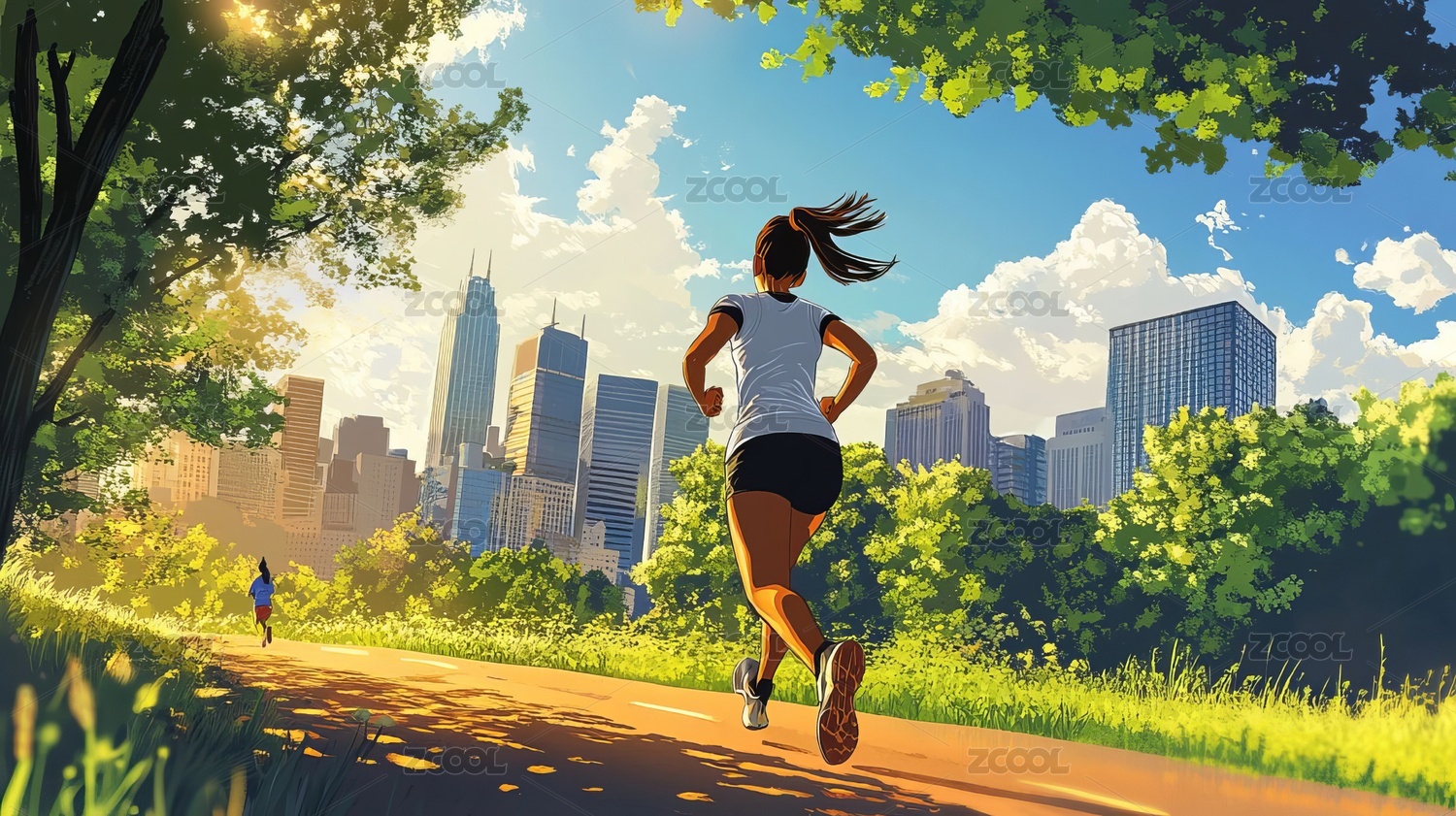 卡通插画公园里的跑步女人