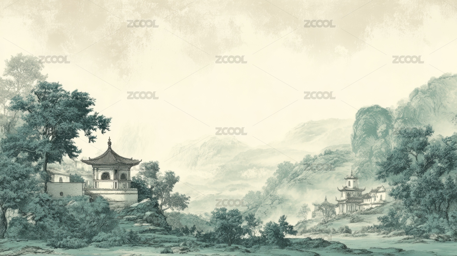 山峦,溪流,雾气,绿植,古建筑,青瓦,飞檐,松树,庭院,楼阁