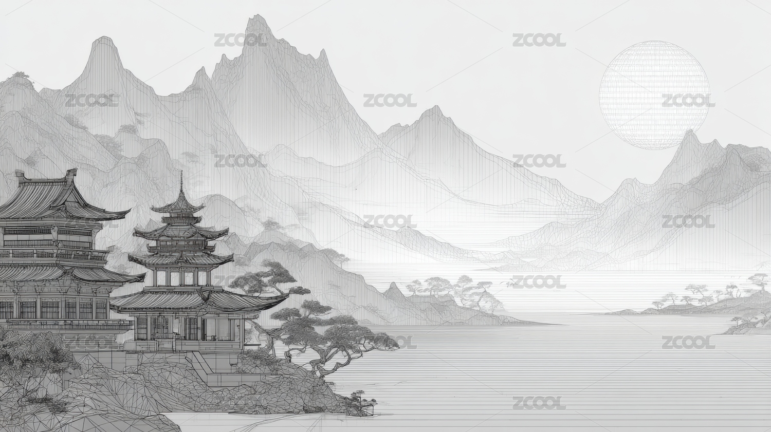 颜色鲜明的工笔画风格中式建筑国风山水插画