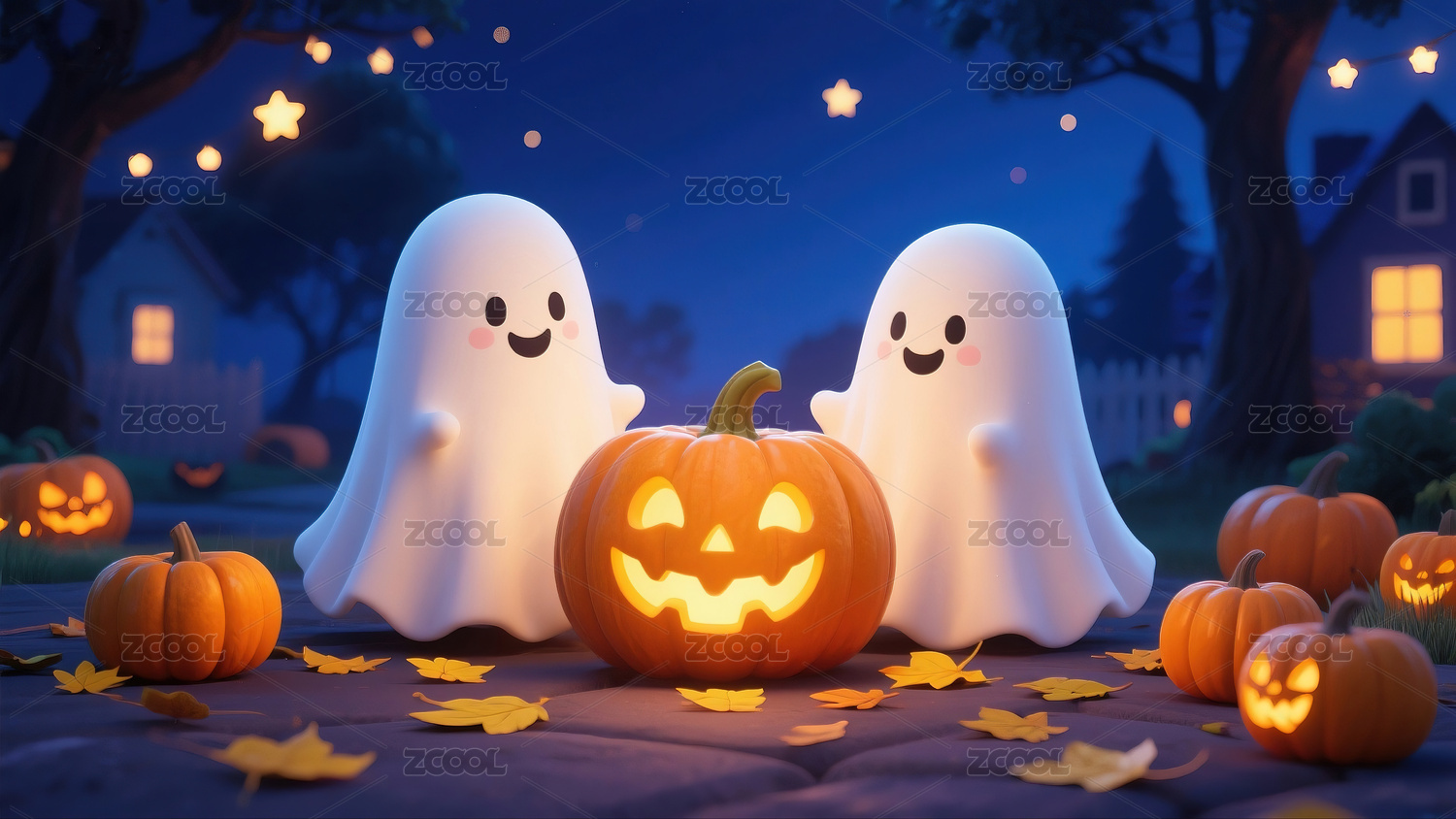 3D庆祝万圣节白色可爱幽灵和邪恶南瓜