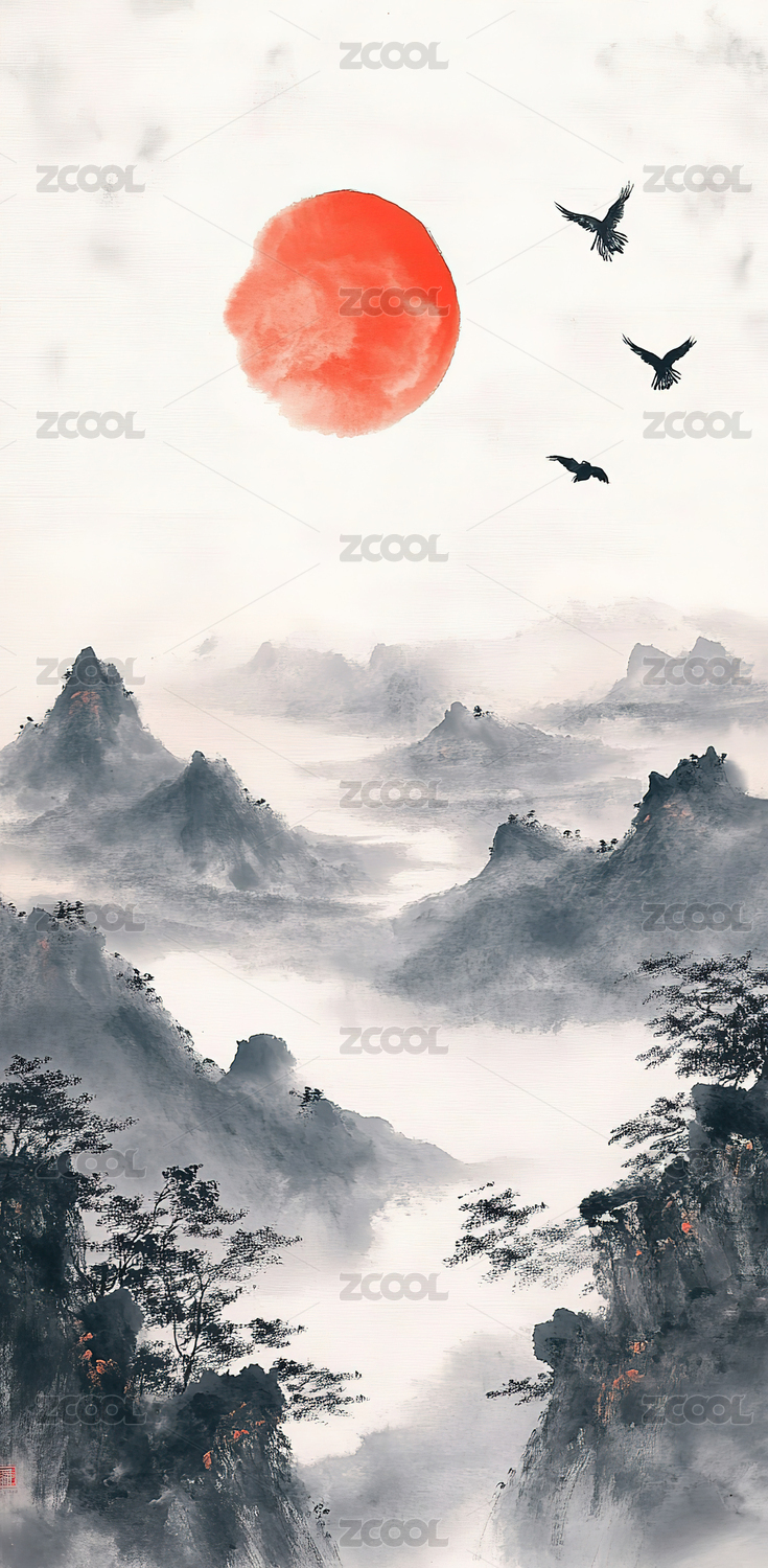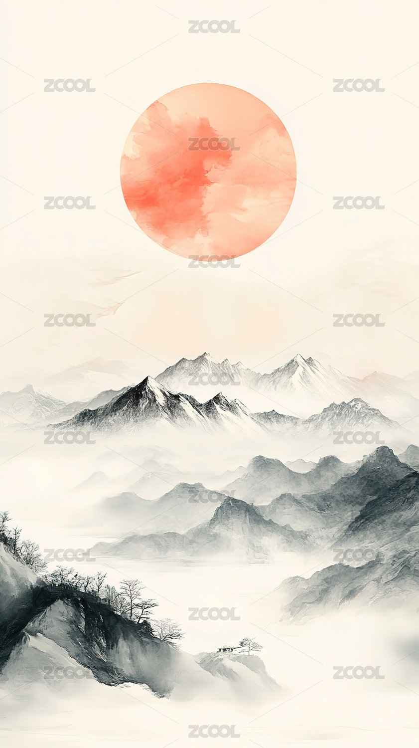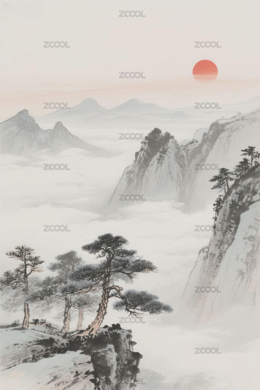 松树,远山,水墨,山峦,云雾,古屋,红日,村落,晨曦,晕染