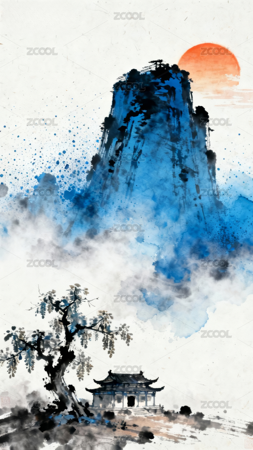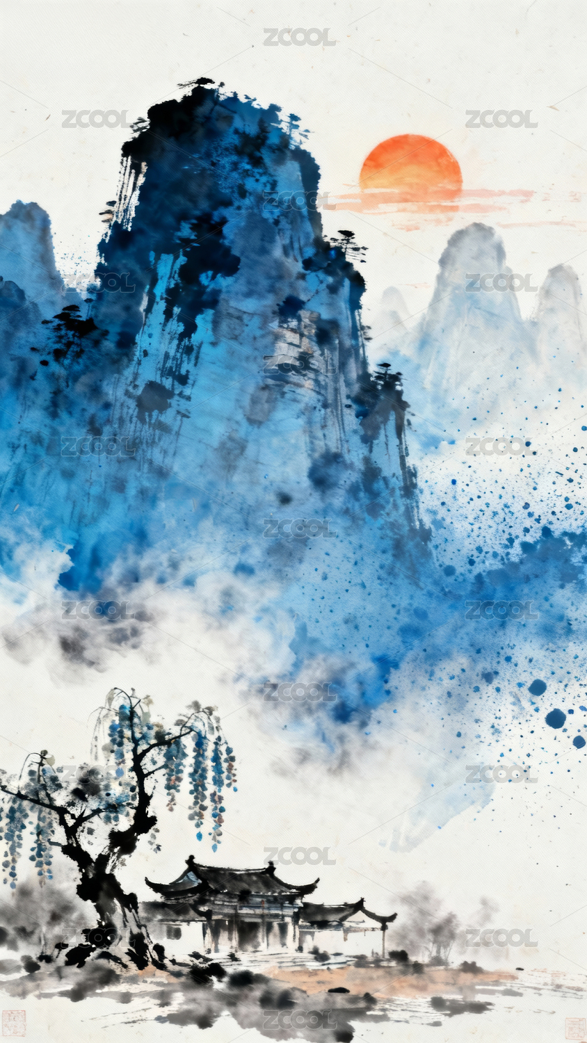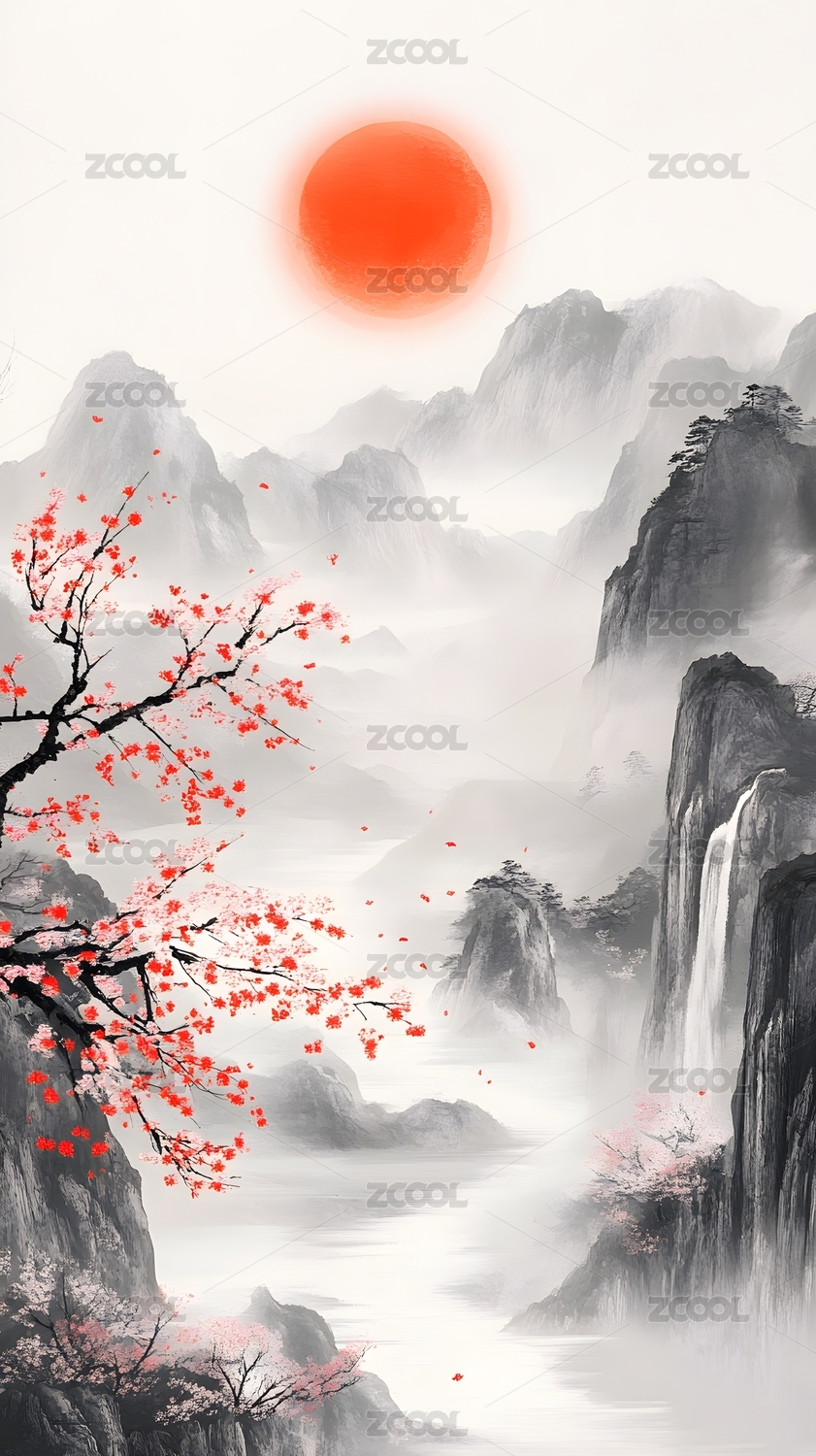 松树,远山,水墨,山峦,云雾,古屋,红日,村落,晨曦,晕染