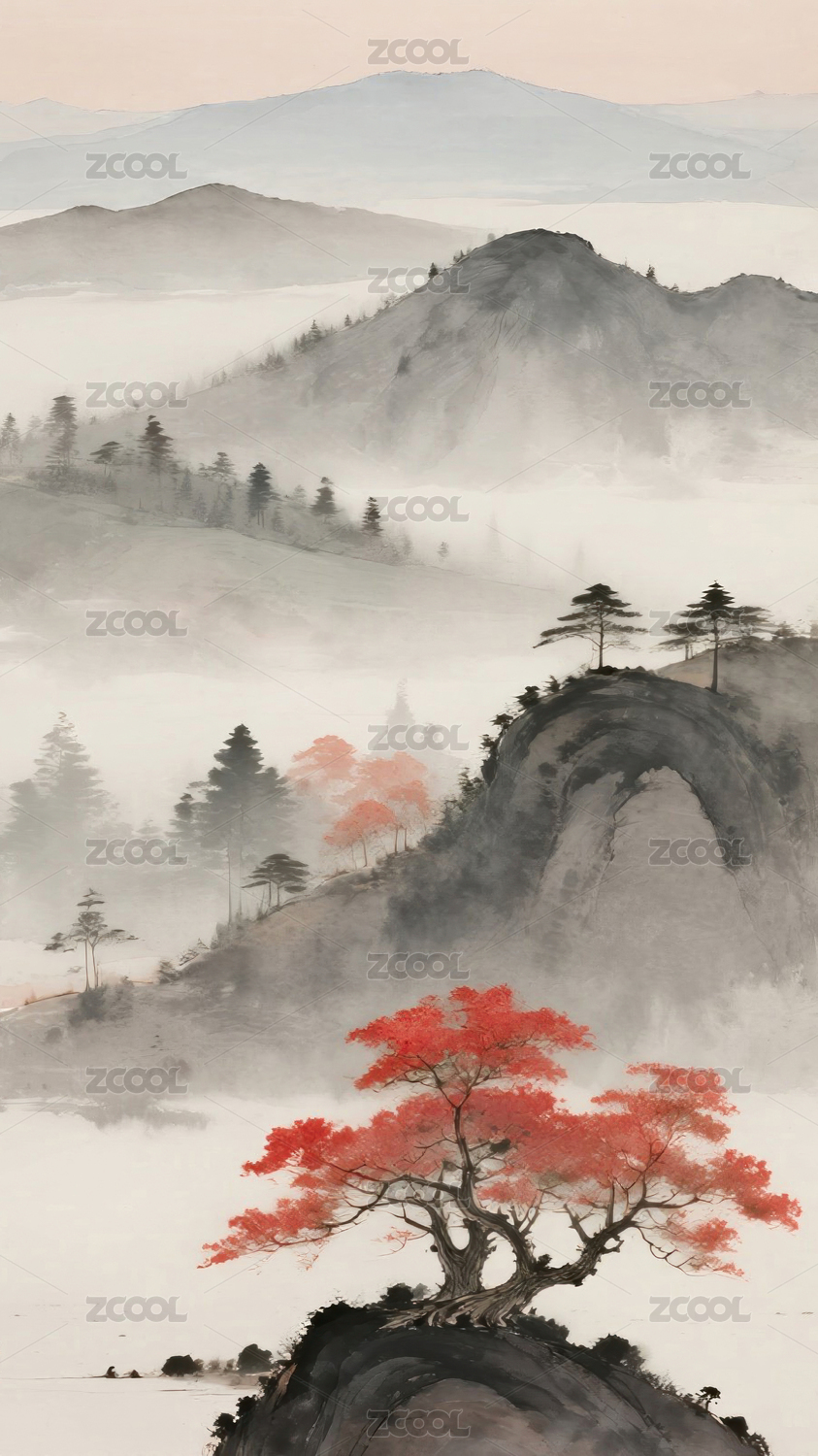 山间红叶水墨意境秋山红树云雾缭绕山水国画
