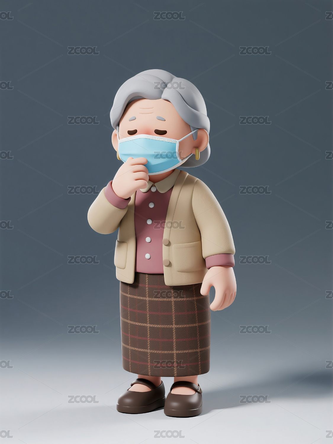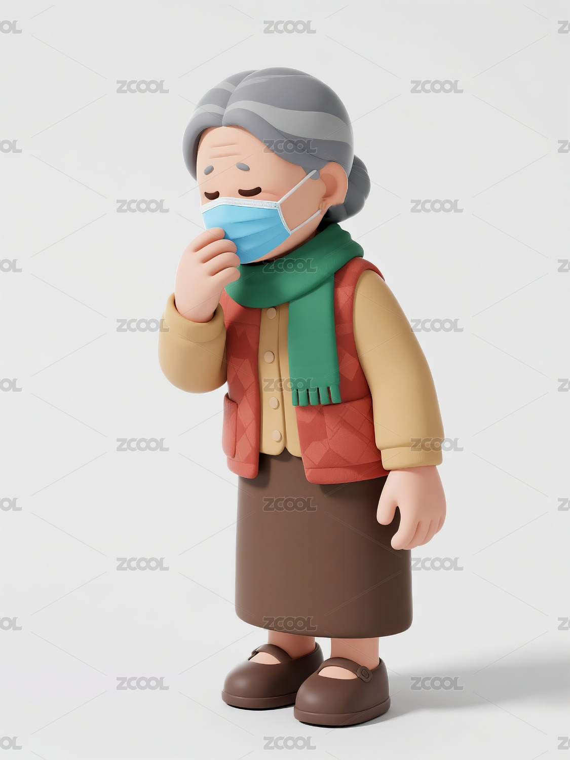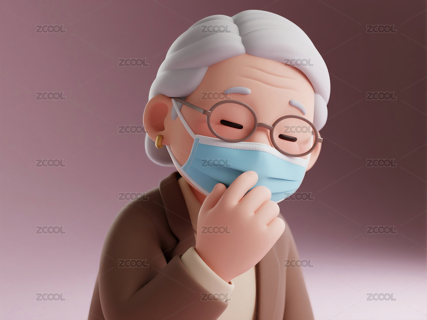 3D,三维,感冒,发烧,咳嗽,气管炎,口罩,奶奶,爷爷,老年人