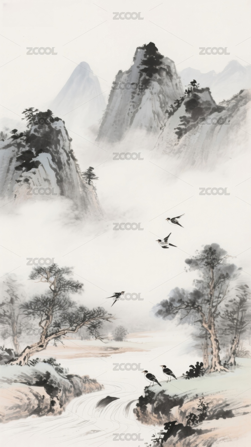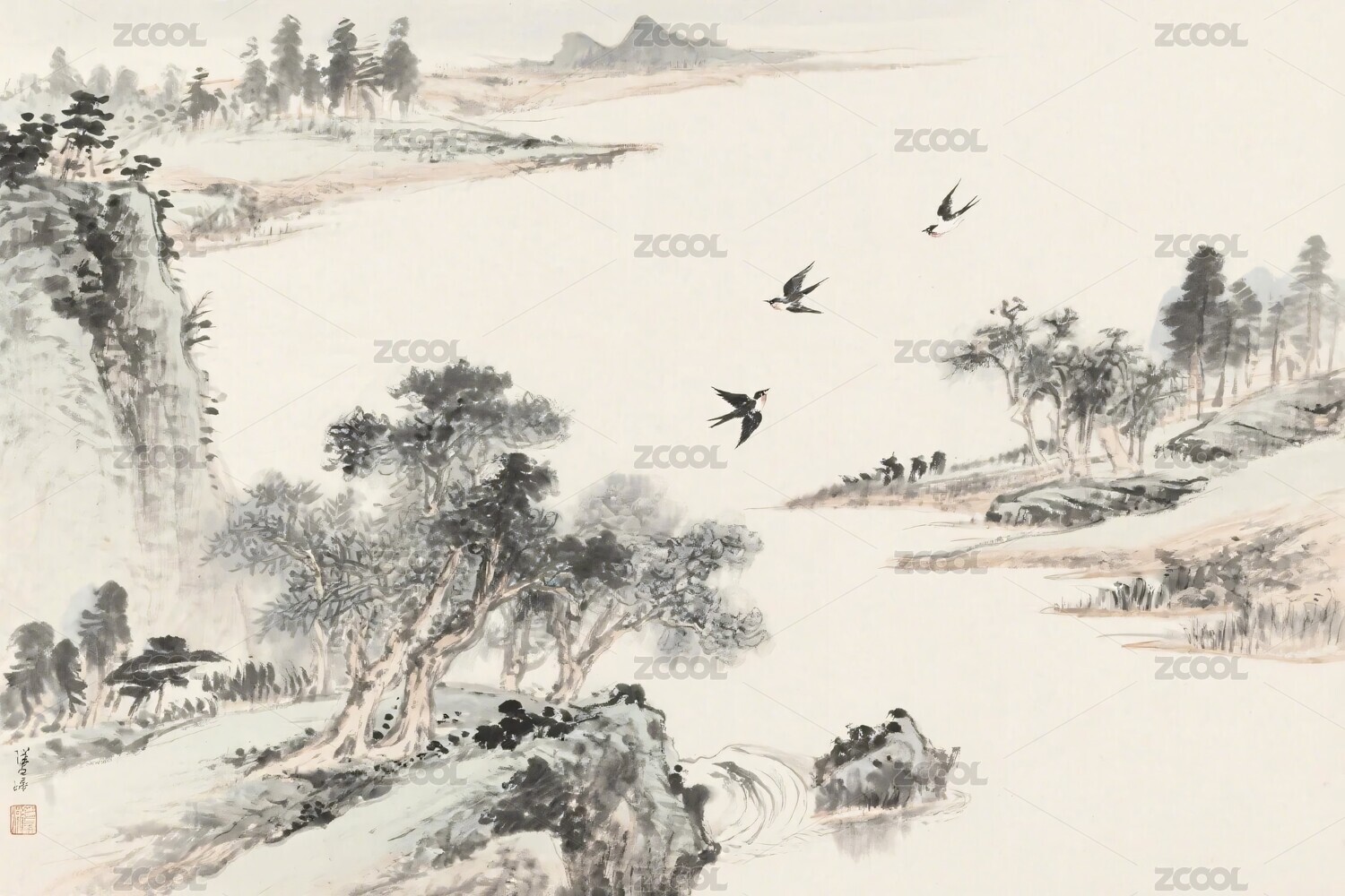 山水,树木,飞鸟,河流,远山,古画,水墨,风景,国画,山水图