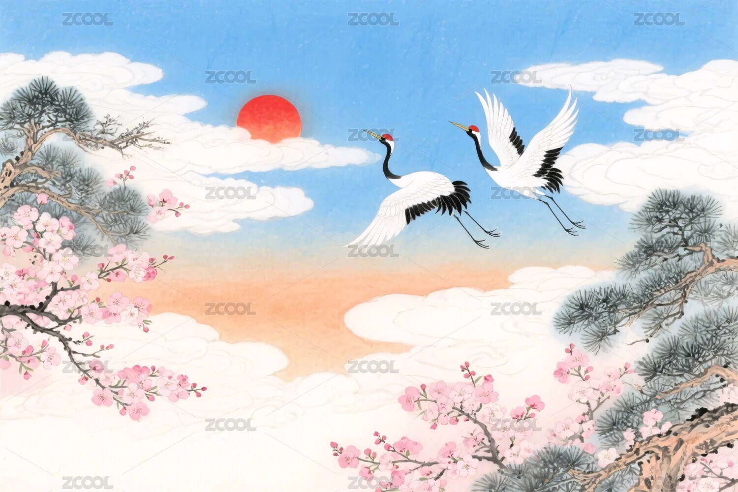 水墨丹顶鹤樱花图