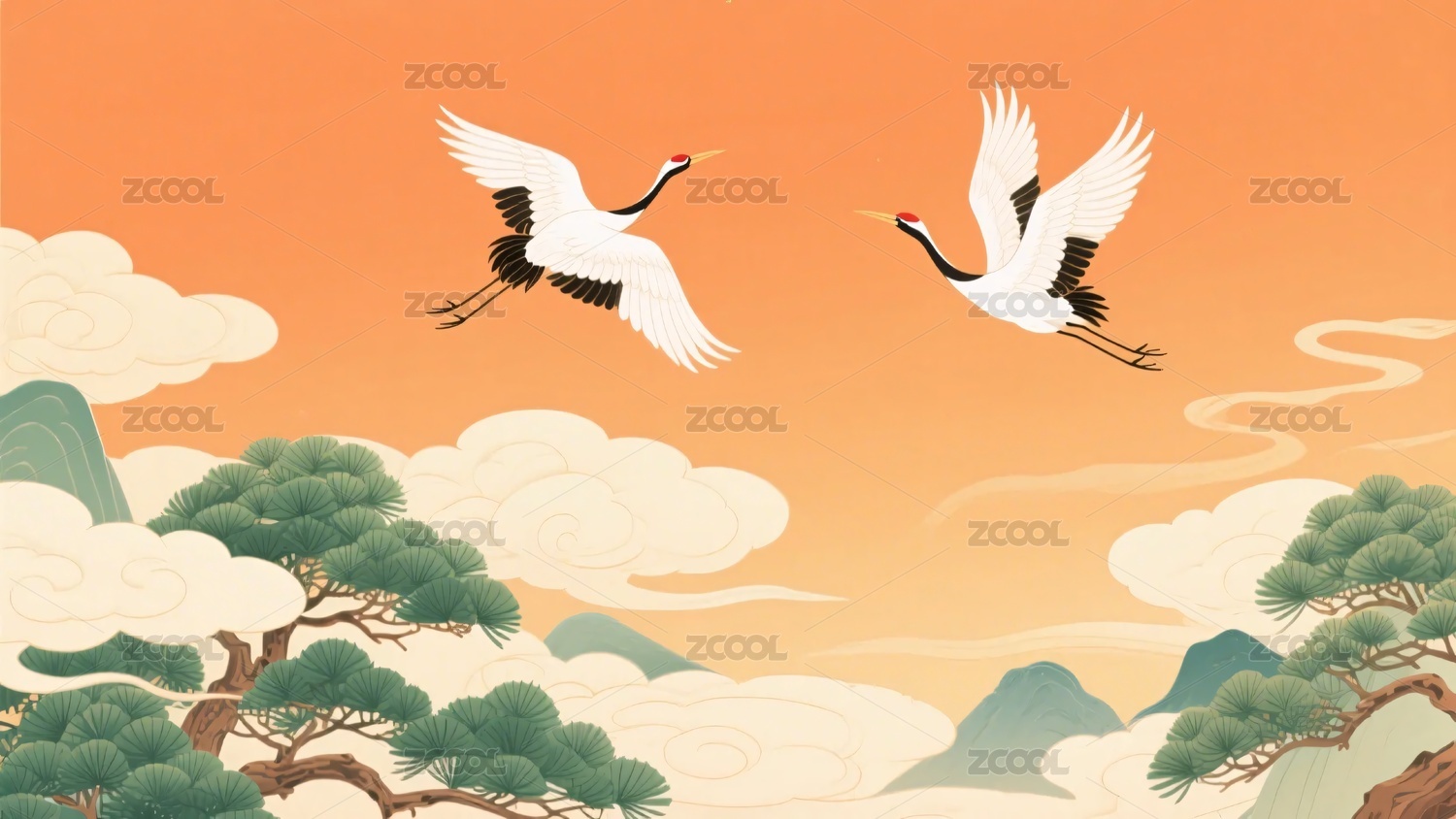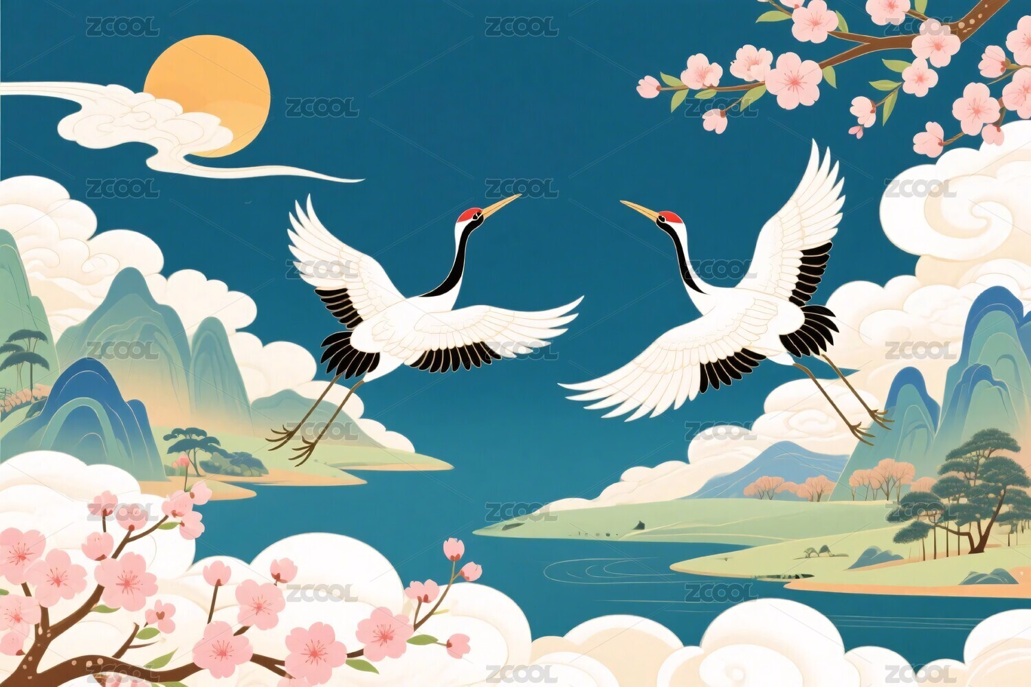 仙鹤,山水,飞鸟,传统,插画,祥云,树木,太阳,东方,绘画