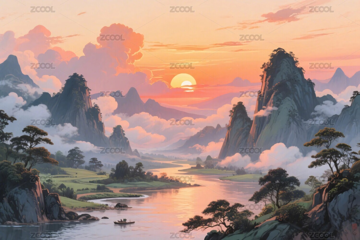 山峰,河流,太阳,云雾,树木,山水,风景,插画,风景画,自然