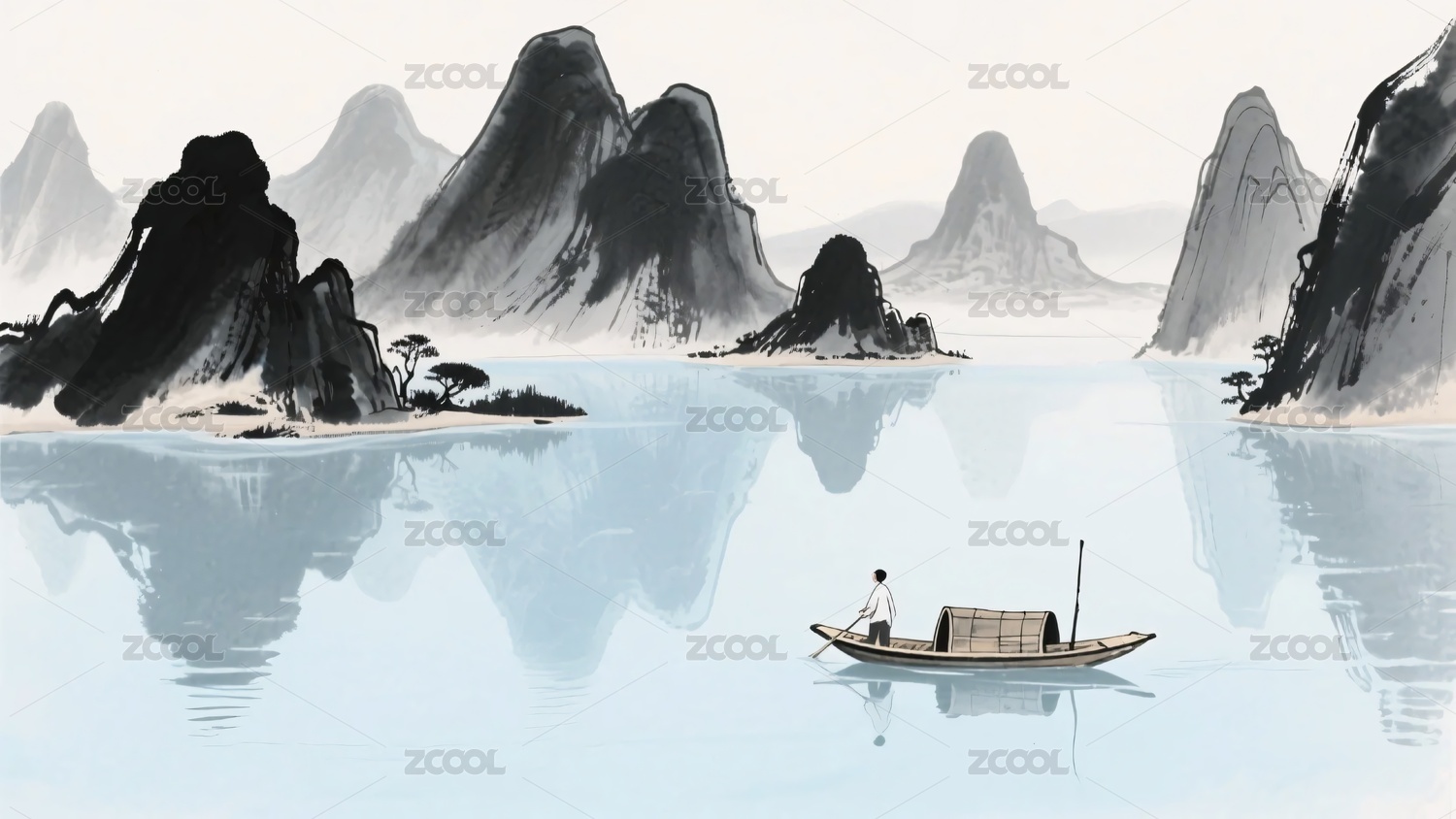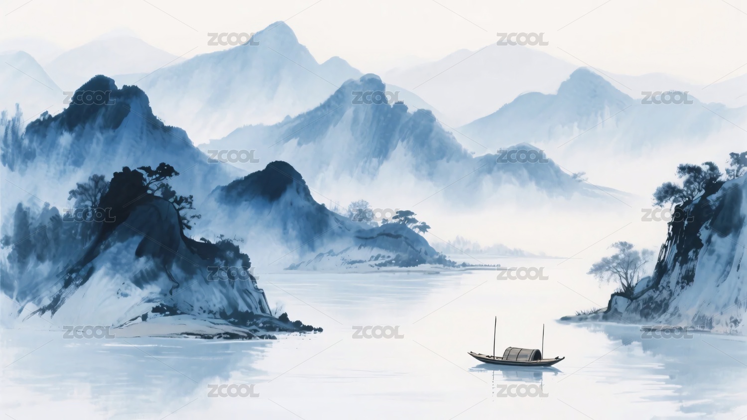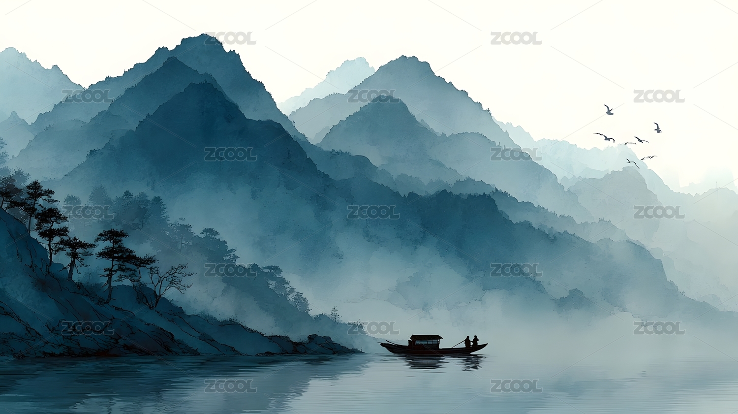云雾,远山,青山,飞鸟,水墨,薄雾,江水,孤舟,墨色,古船