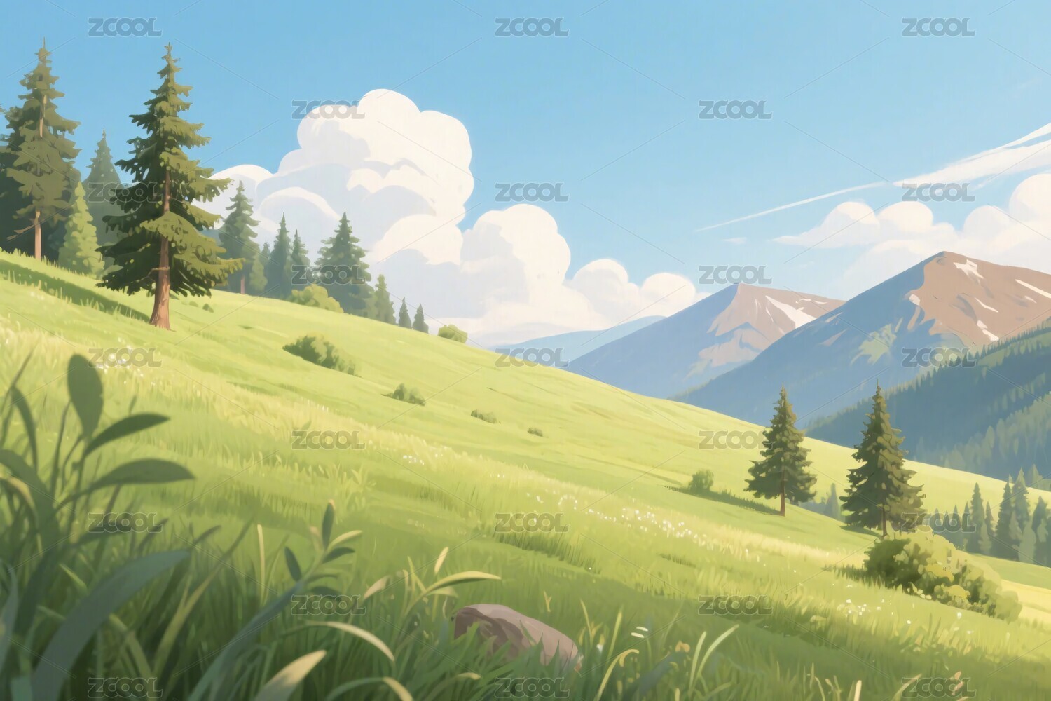 山脉,草地,树木,蓝天,白云,田园,风景,插画,背景,自然