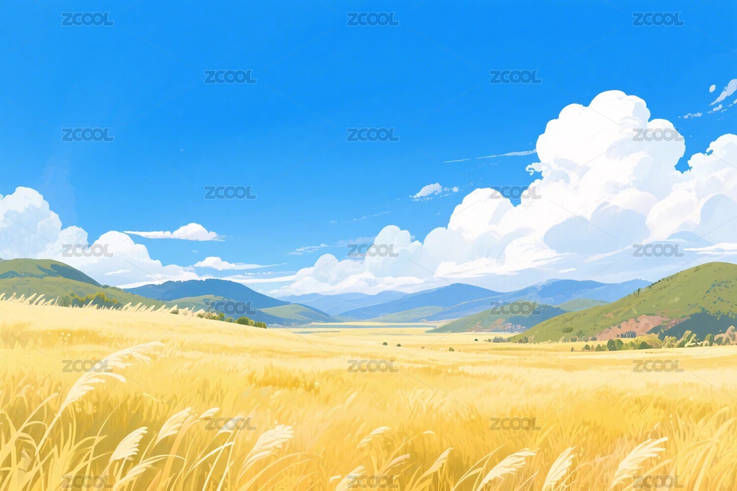 金黄麦田与连绵山丘的田园风光