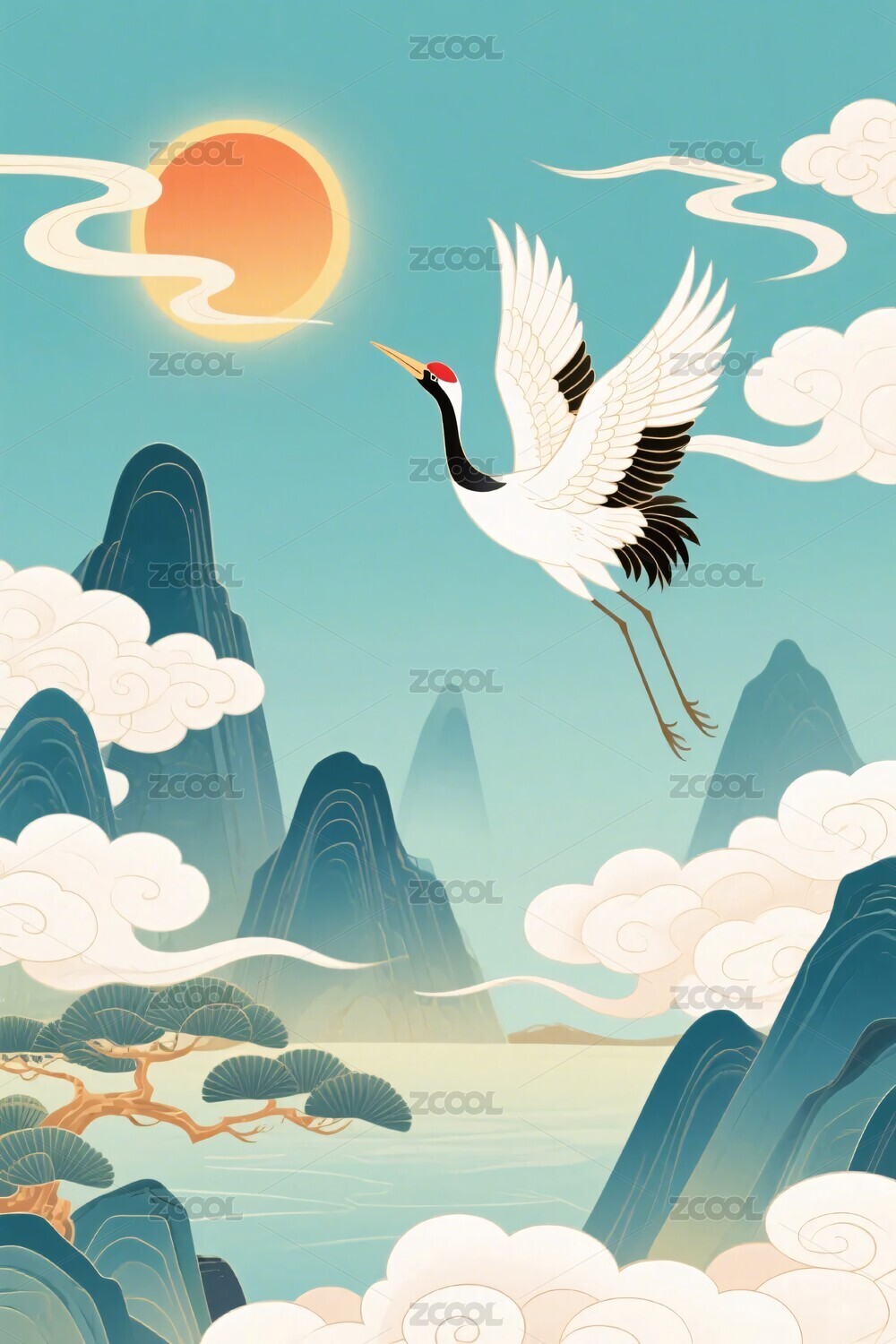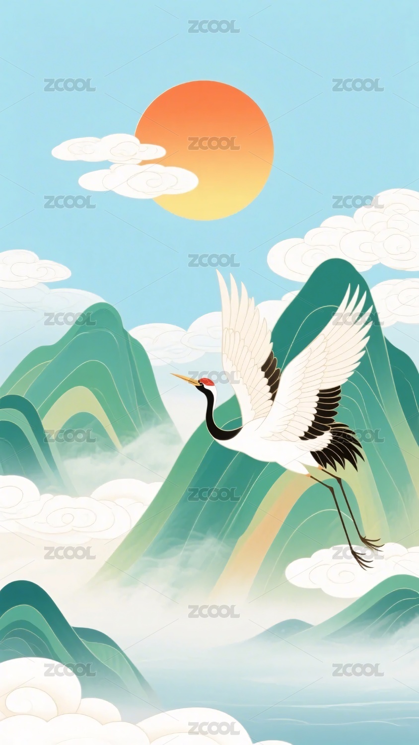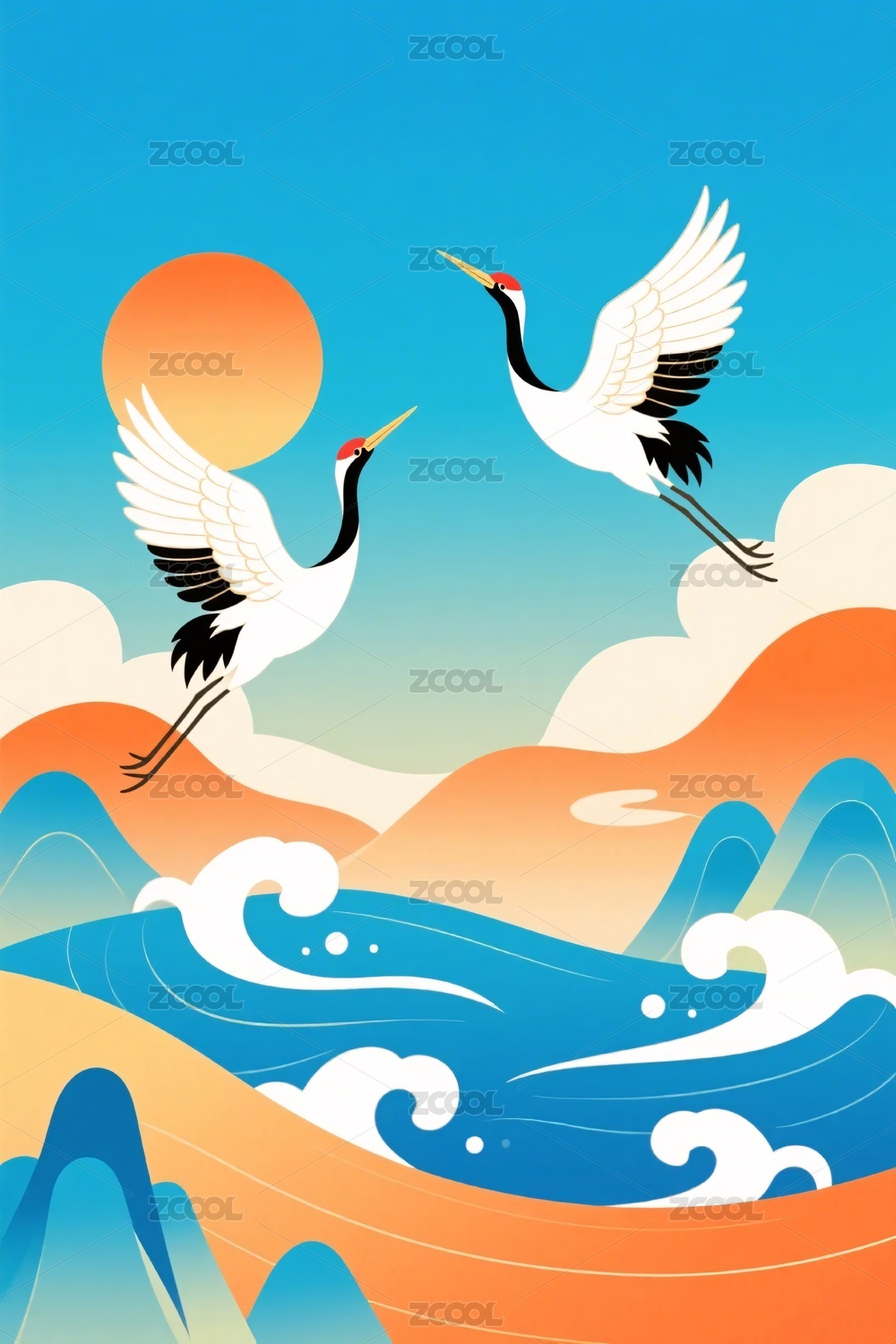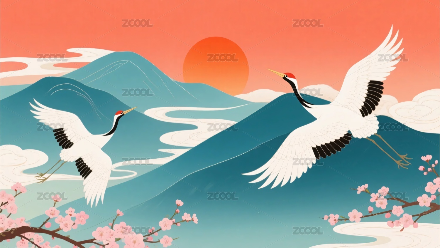 丹顶鹤,飞翔,插画,模板,夕阳,山峦,云朵,自然,风景,艺术