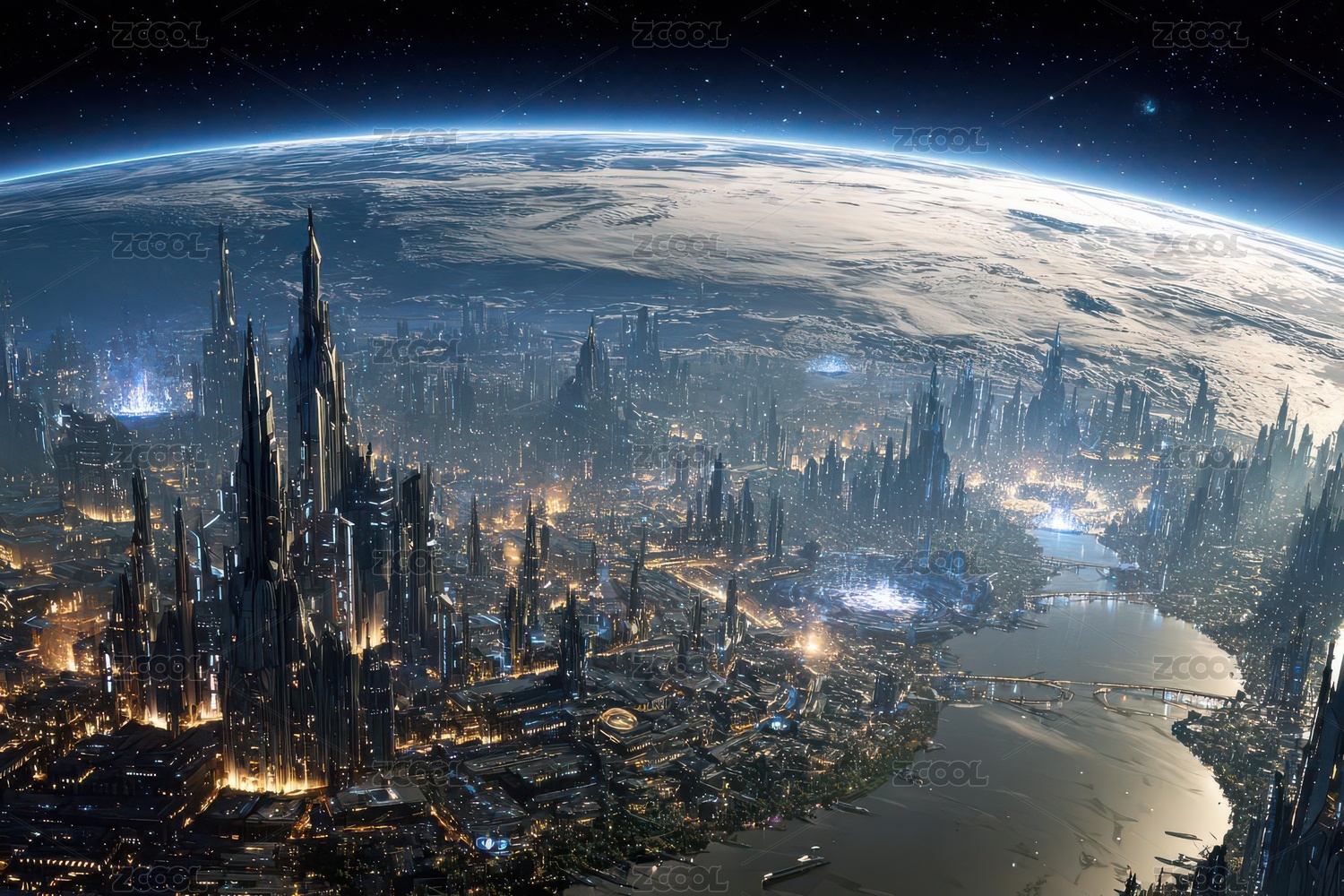 科技感,城市,高楼,灯光,河流,星球,云层,夜空,星河,未来感