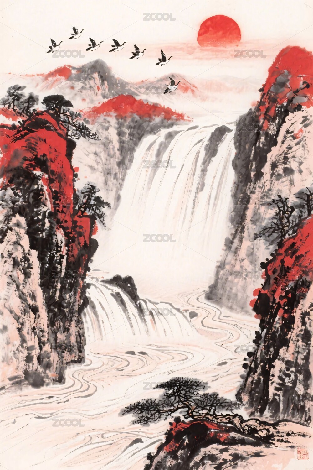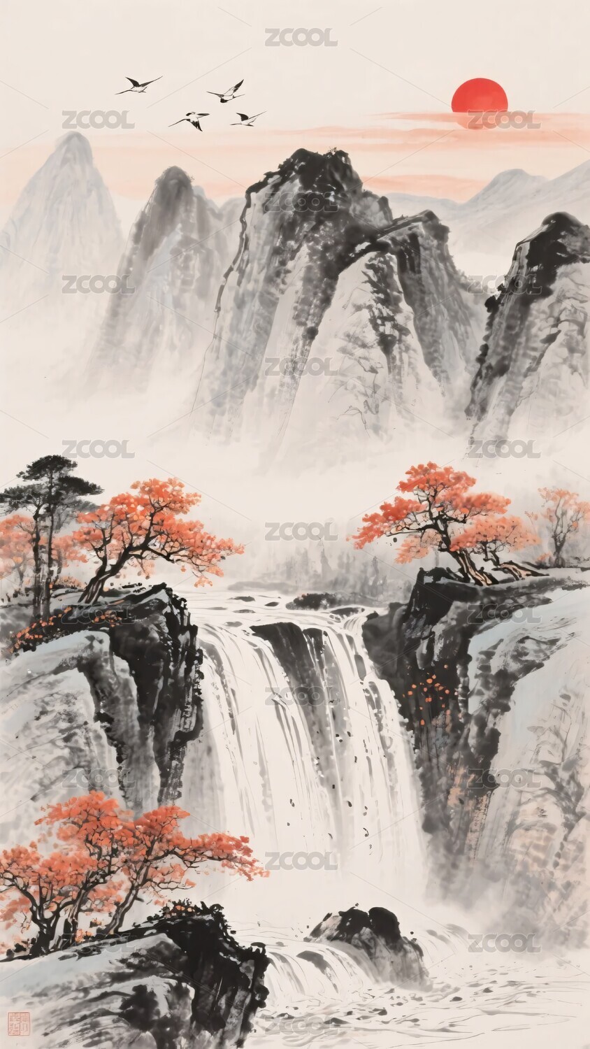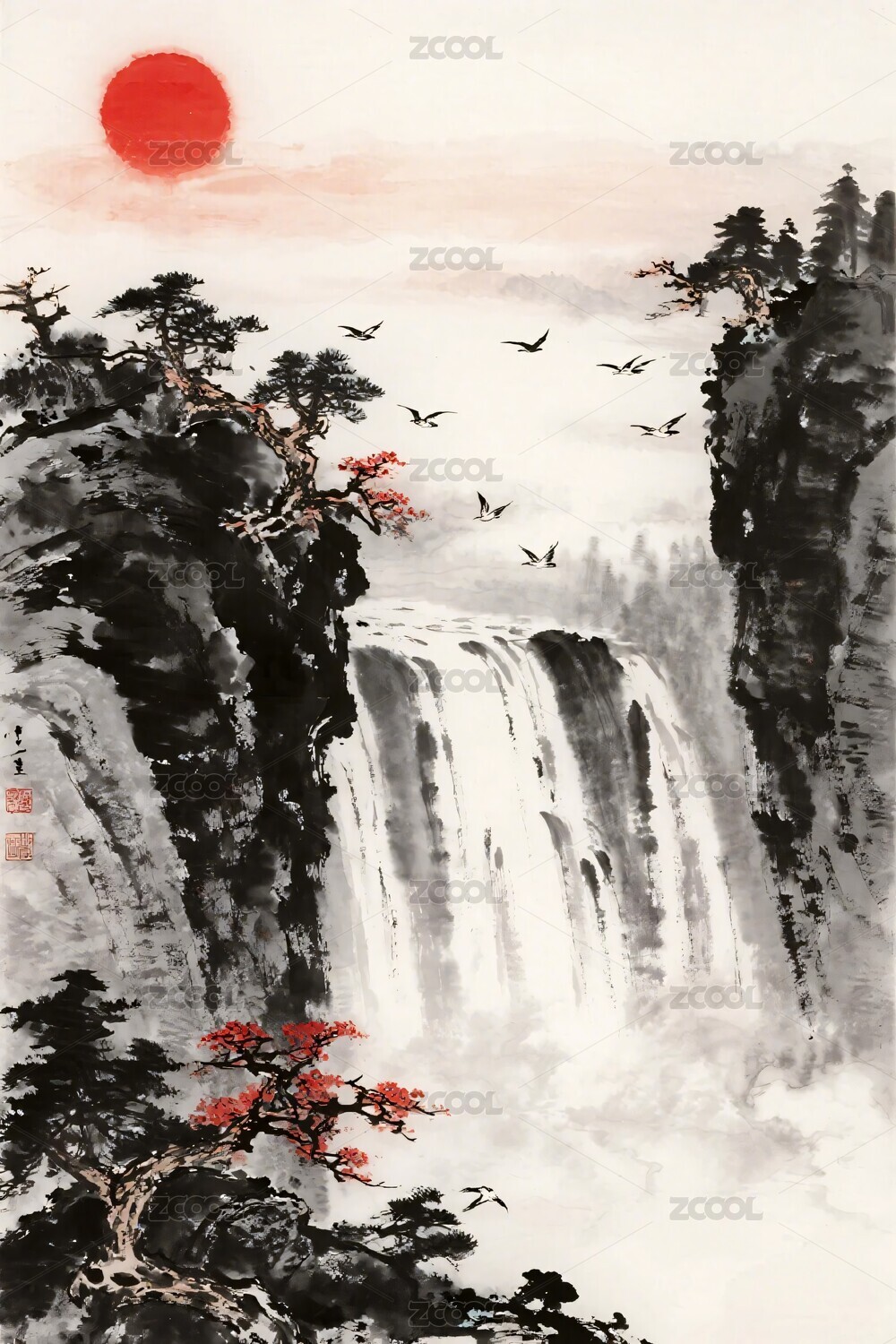 山水,瀑布,水墨,国画,风景,树木,飞鸟,红日,传统,艺术