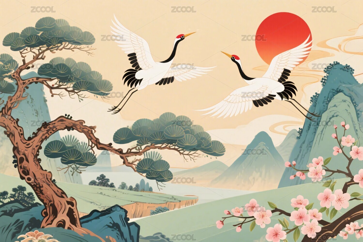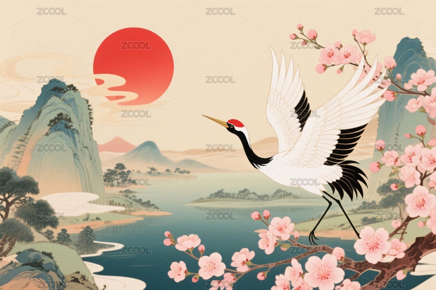 山水樱花丹顶鹤插画