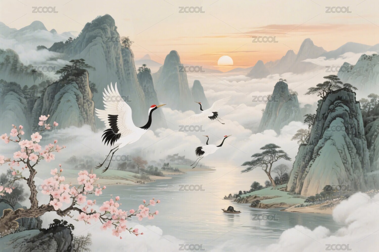 山水,丹顶鹤,风景,插画,国画,山水画,自然,云雾,河流,花鸟