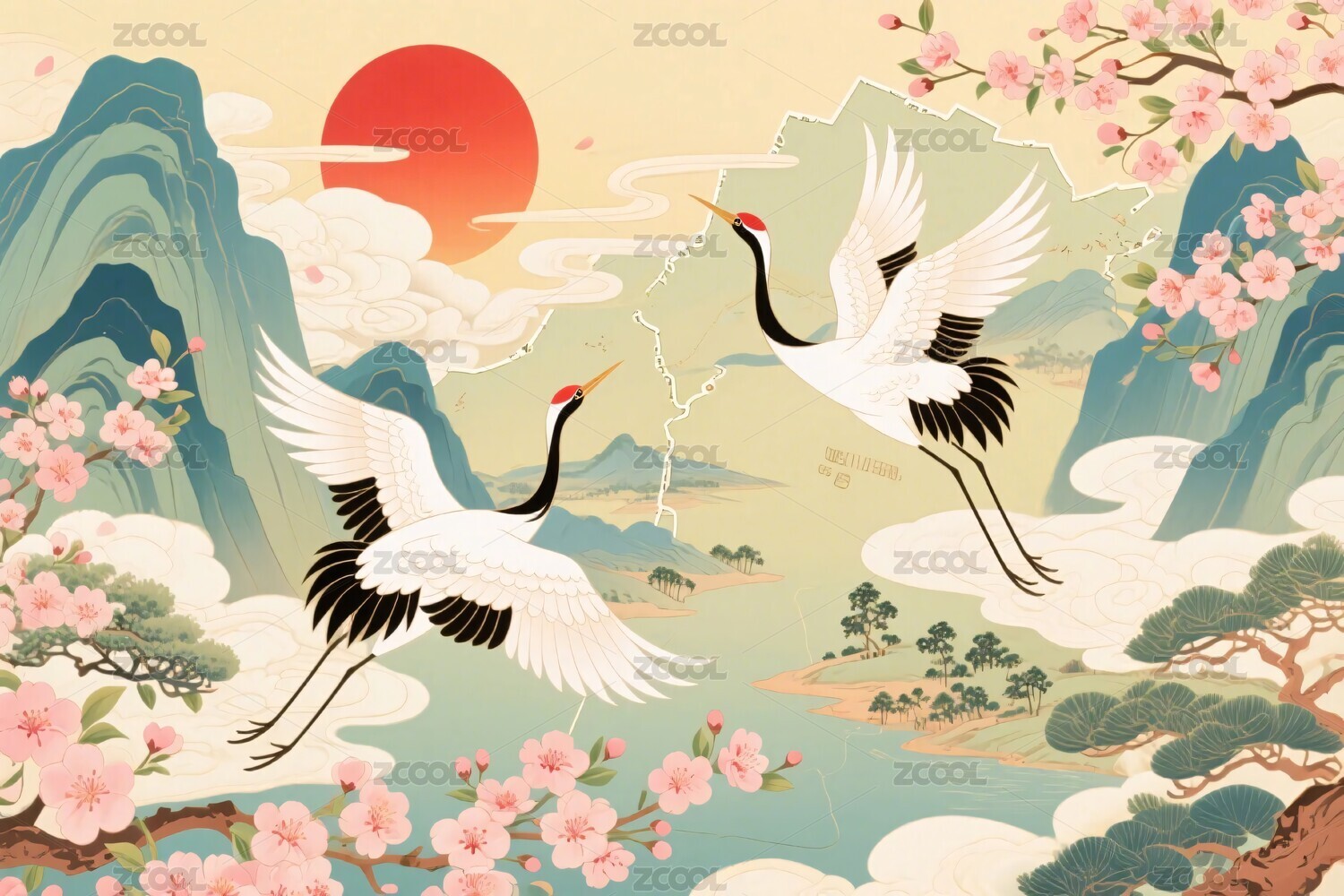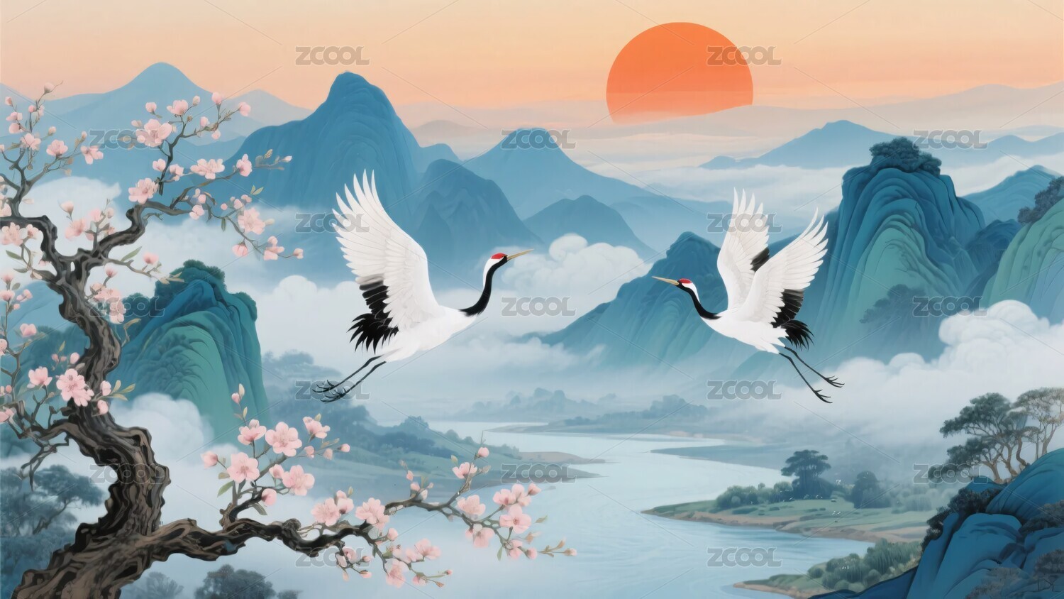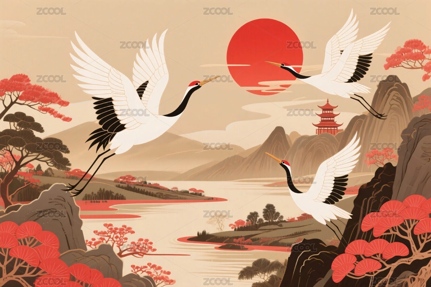 仙鹤翱翔于山水红日间