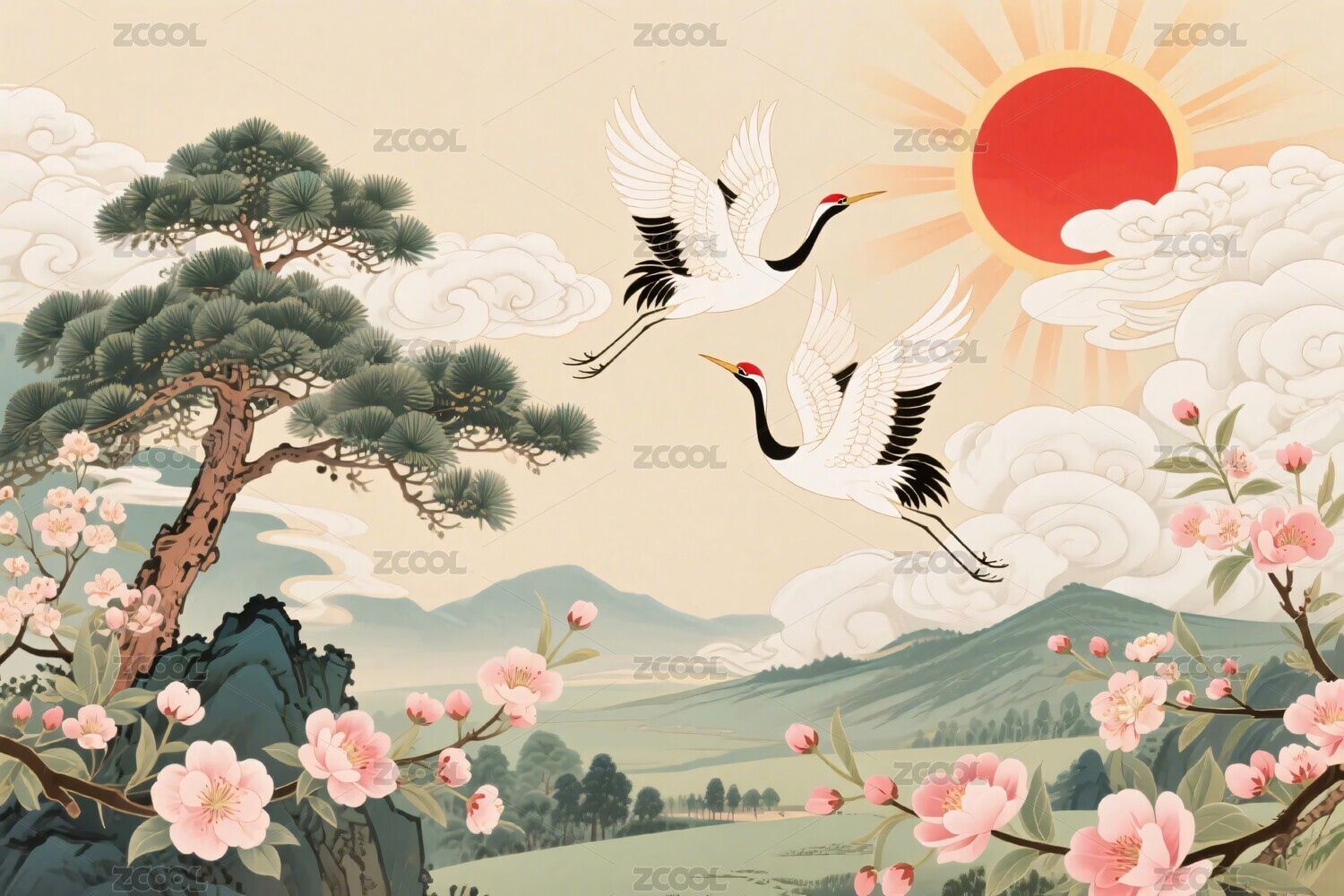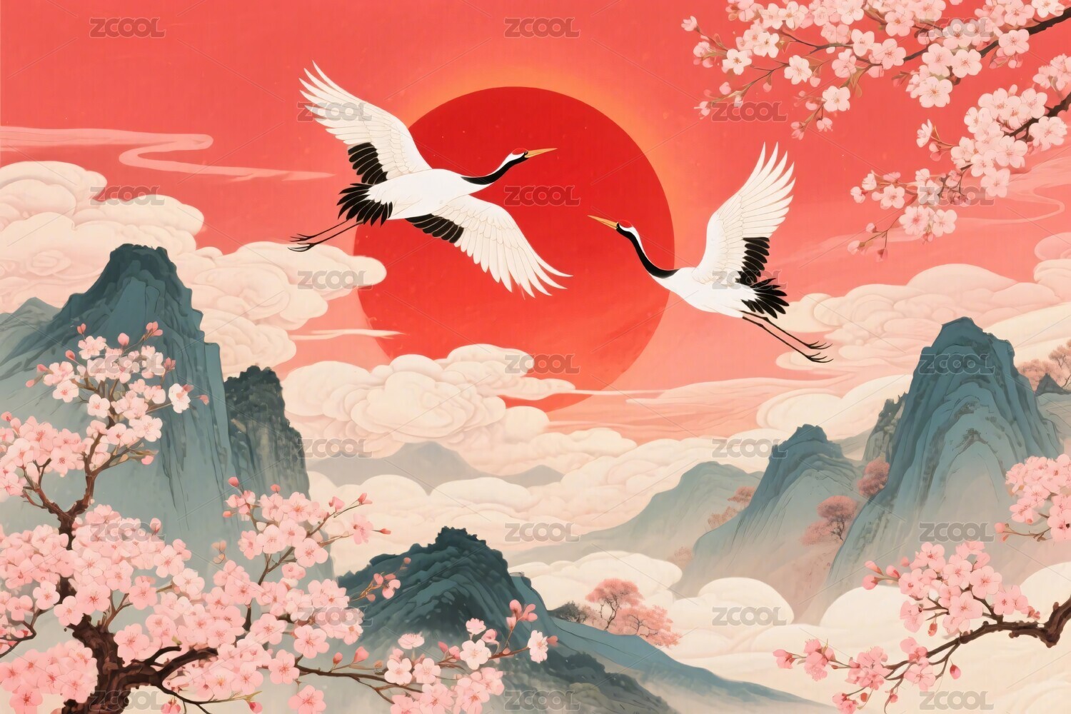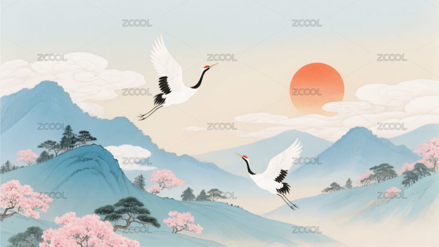 仙鹤翱翔于山水红日间