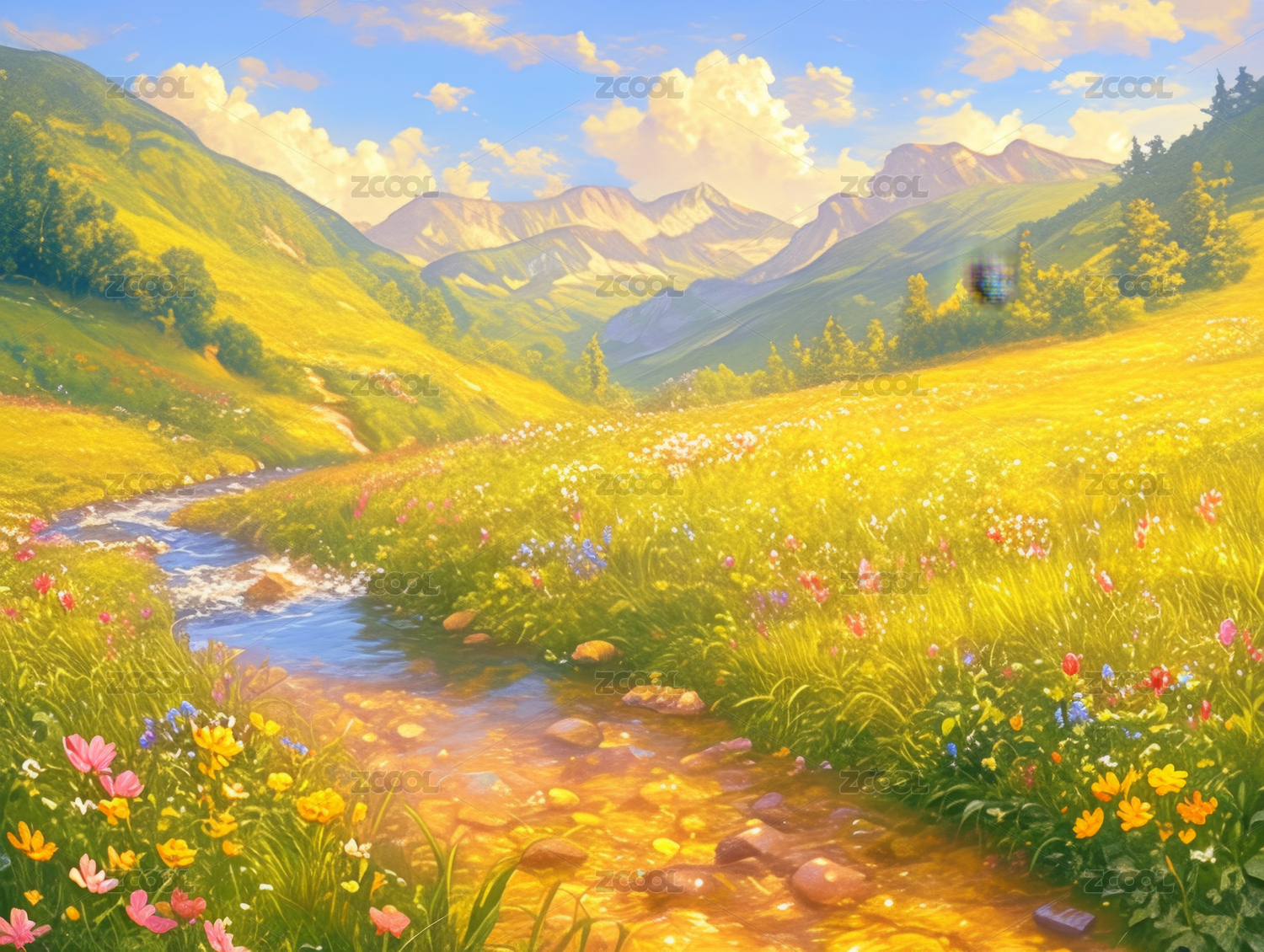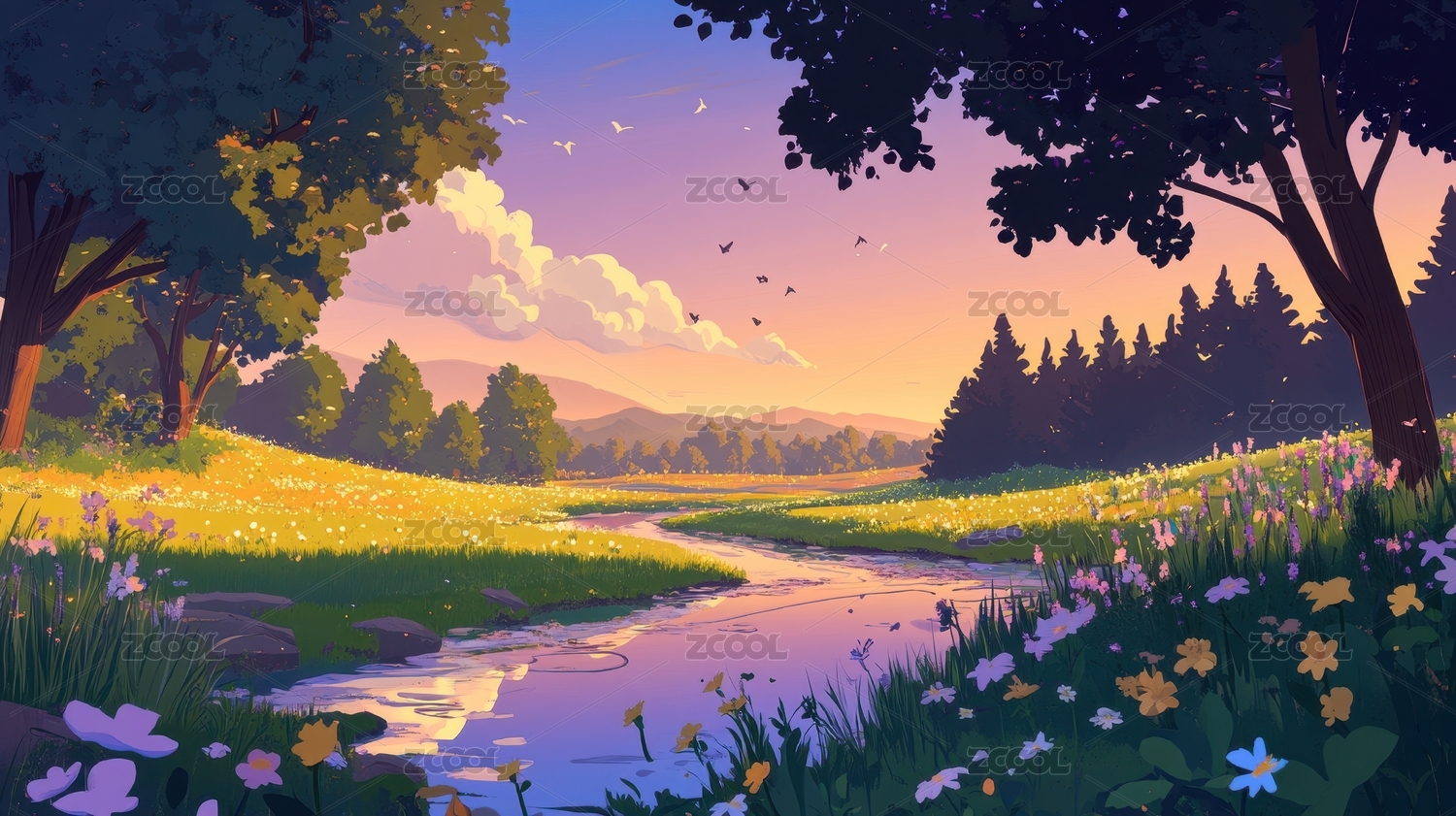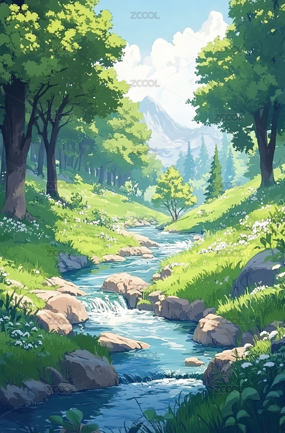 山水,风景,河流,树木,花草,自然,风景画,水彩,插画,田园