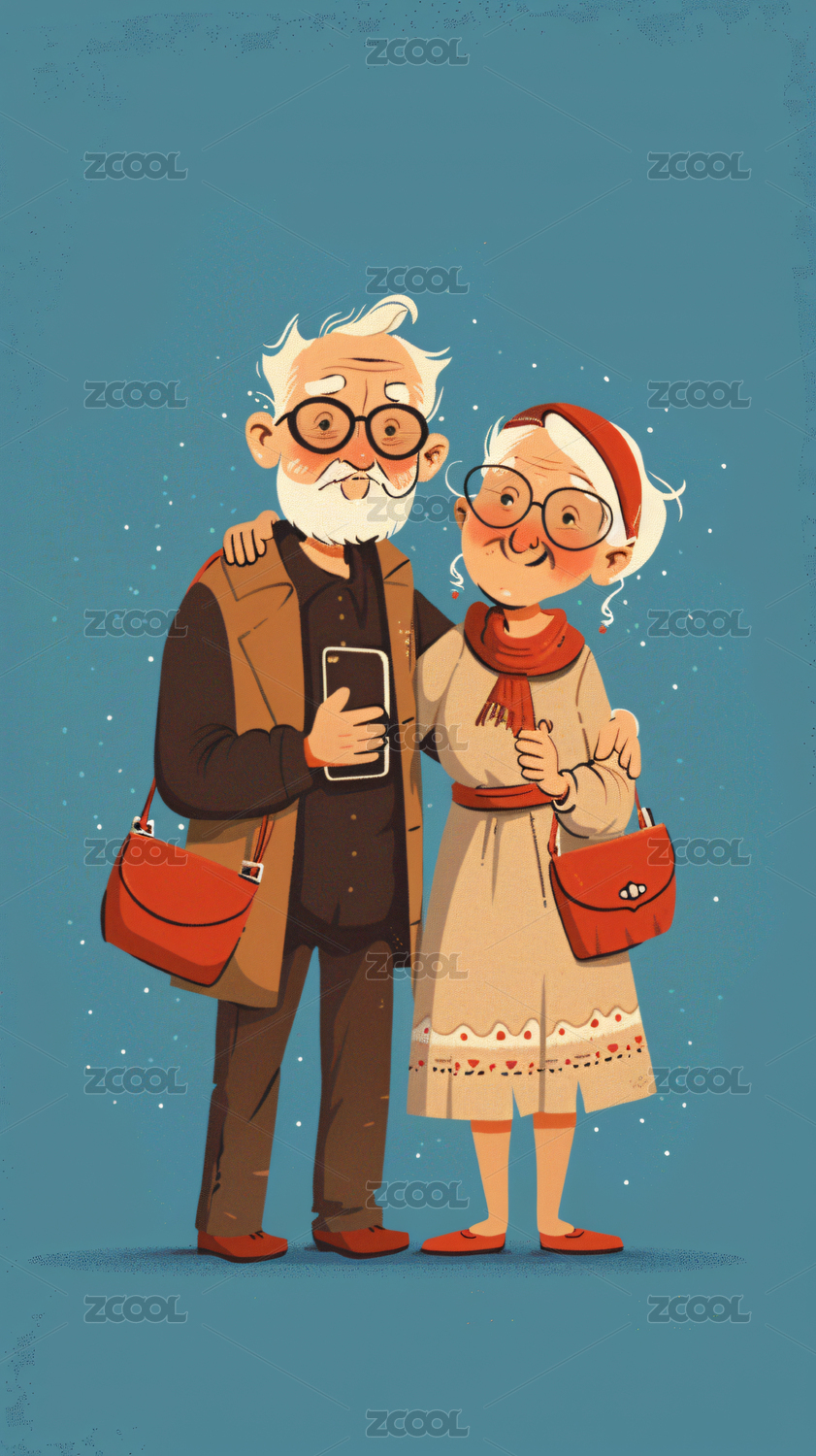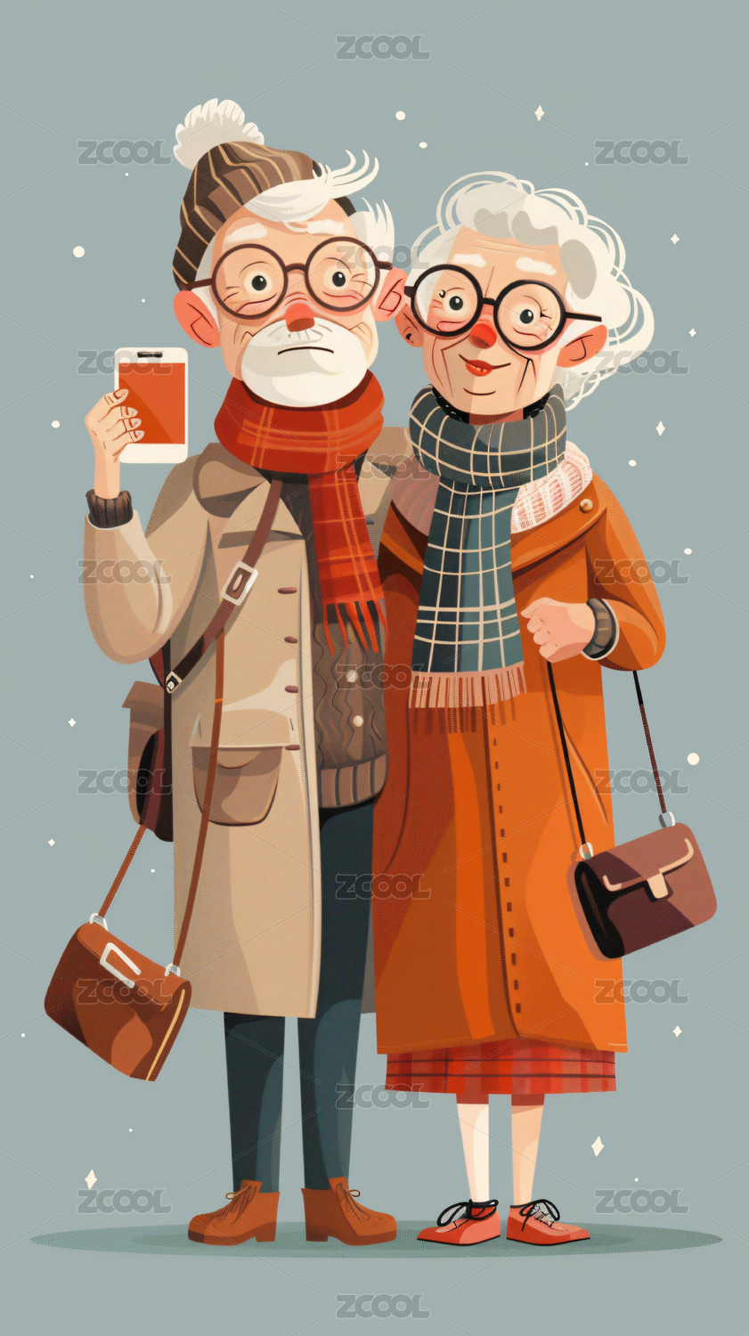 拿着手机自拍的老爷爷和老奶奶插画
