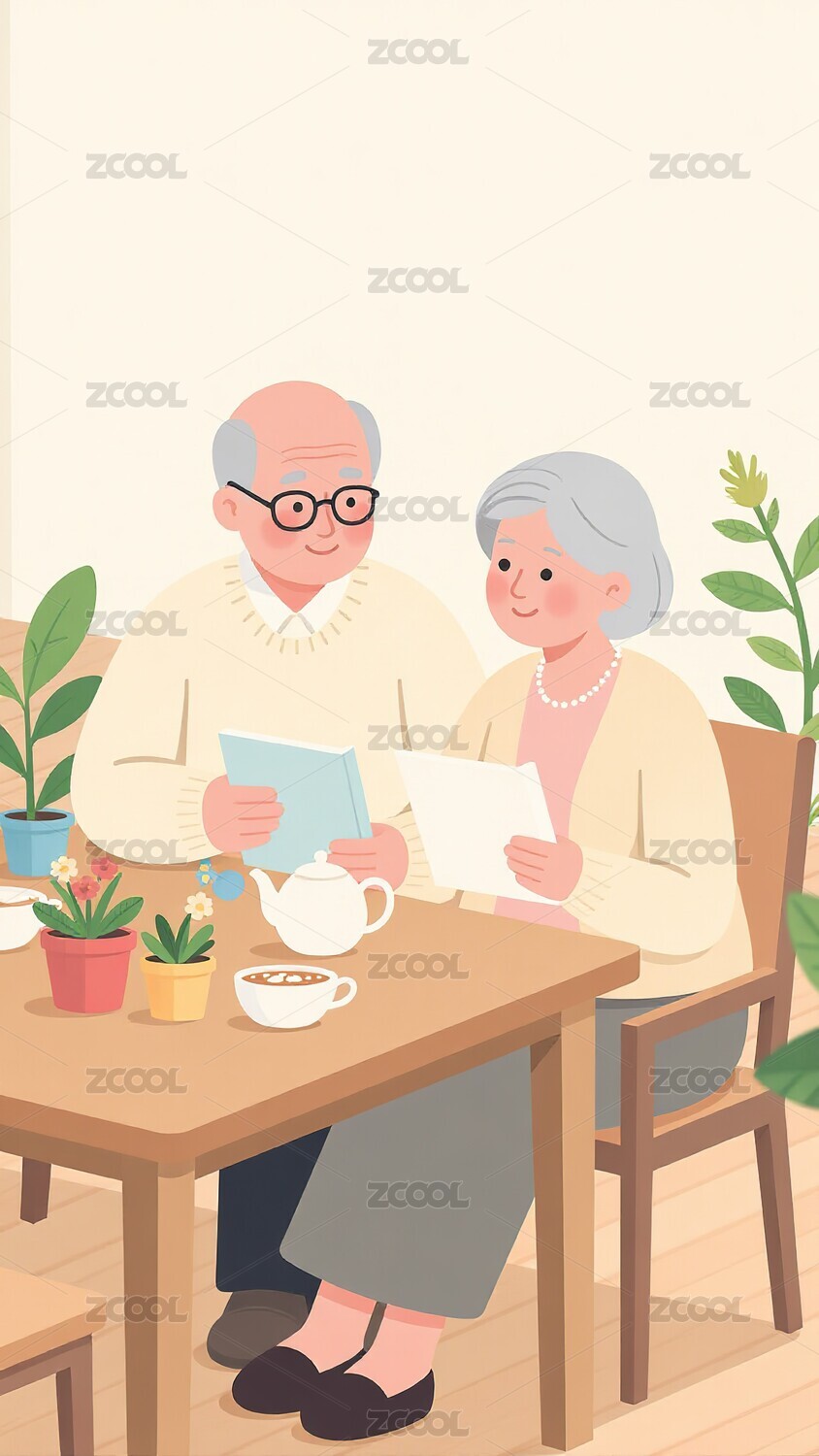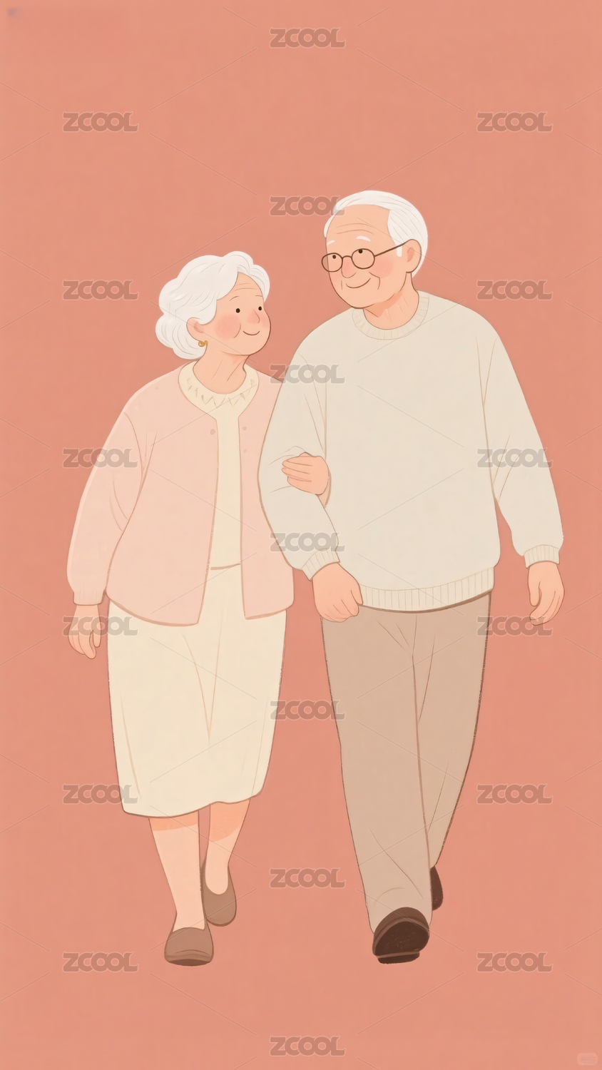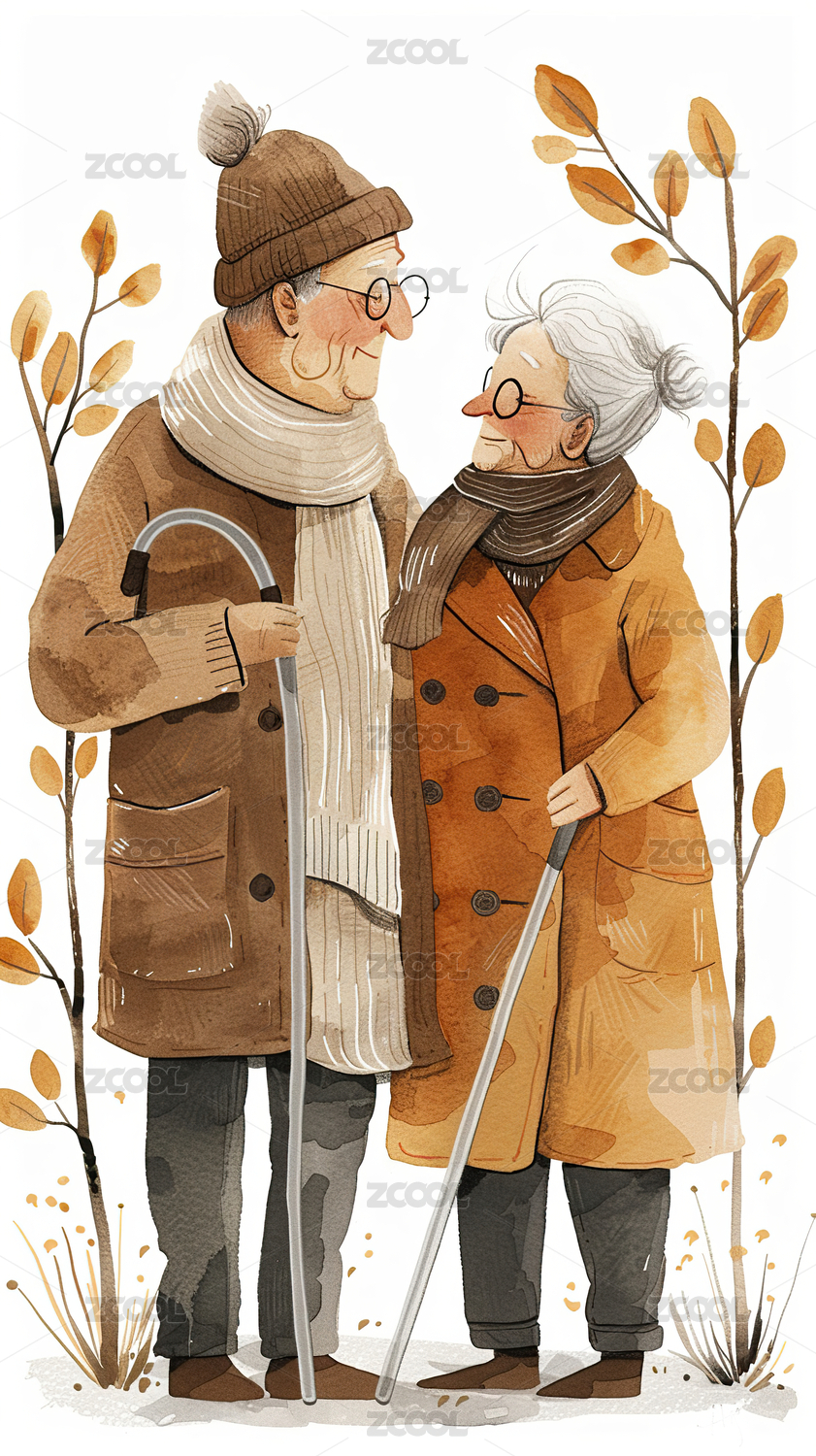 温馨可爱的老年夫妇水彩插画