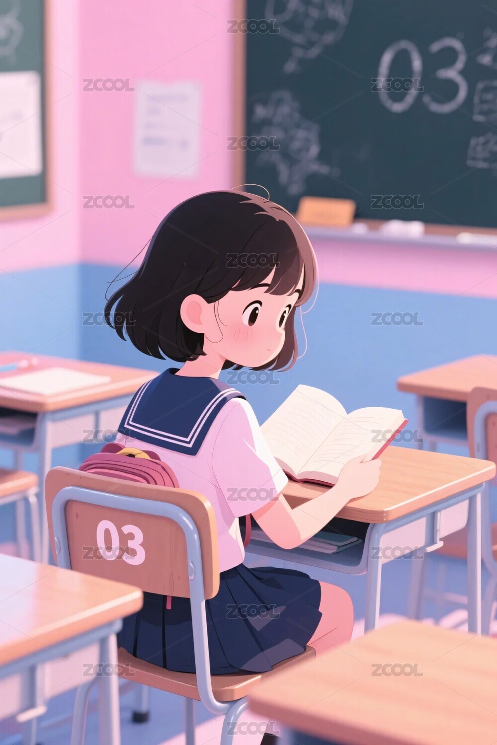 教室阅读少女插画