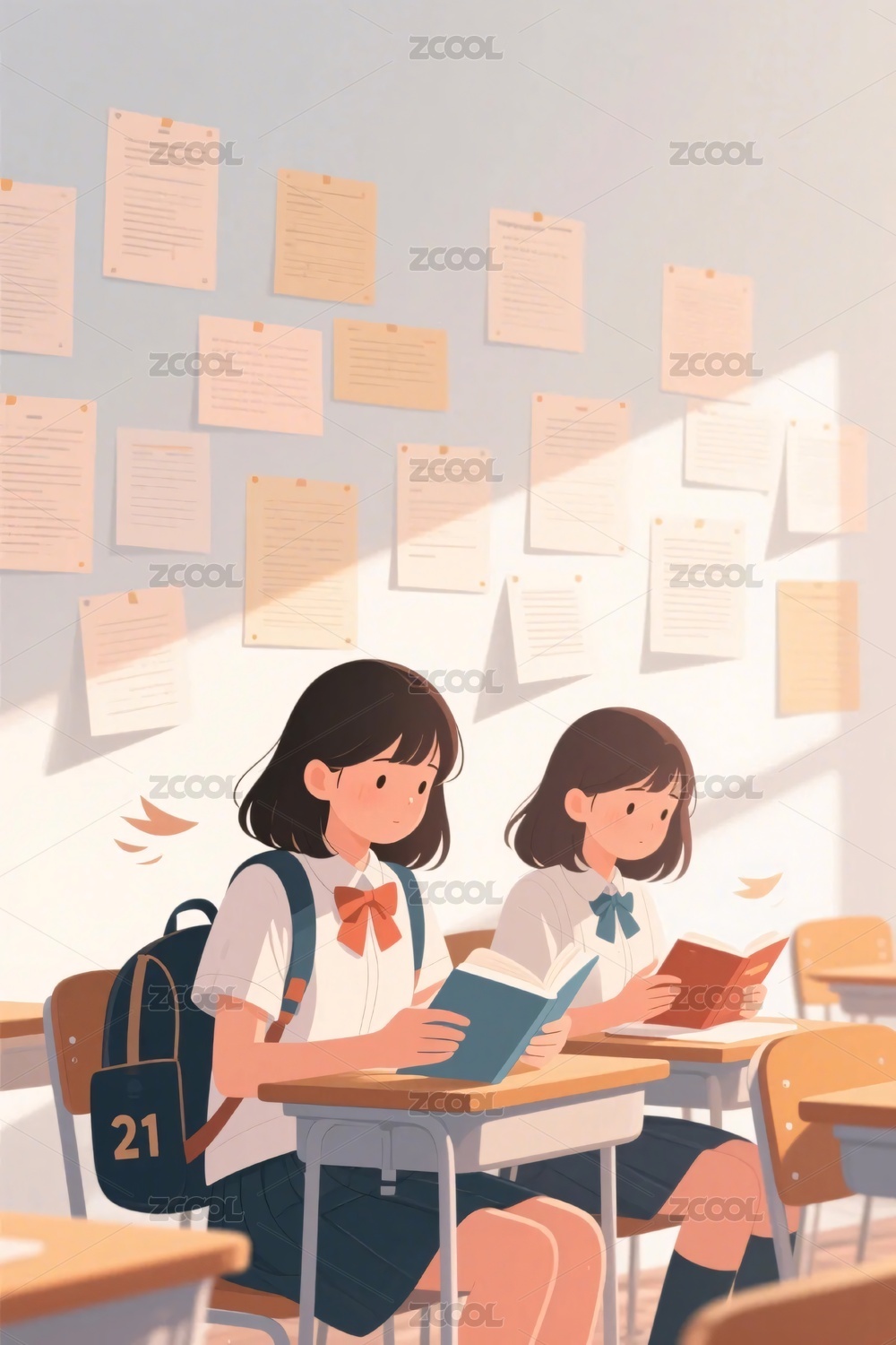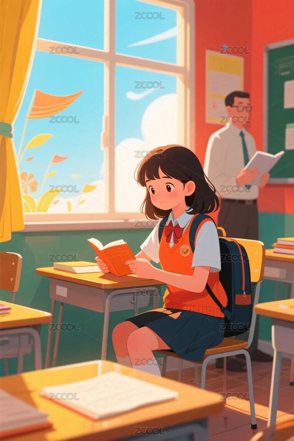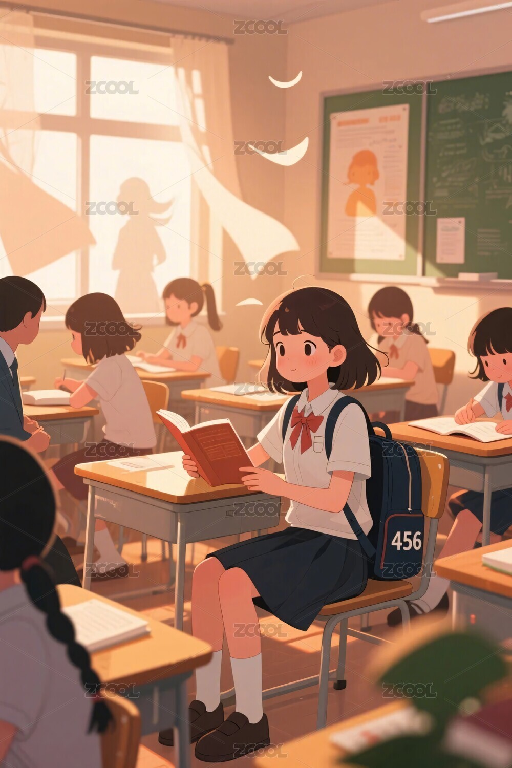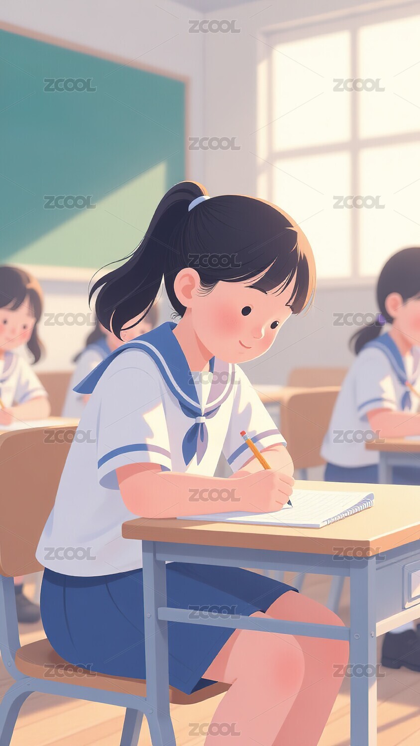女孩,教室,课桌,黑板,校服,书包,文具,纸张,插画,模板