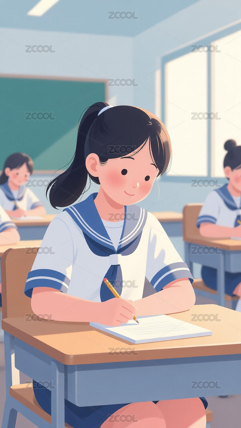 学生们,教室,课桌,书本,文具,校服,黑板,彩笔涂鸦,插画,卡通