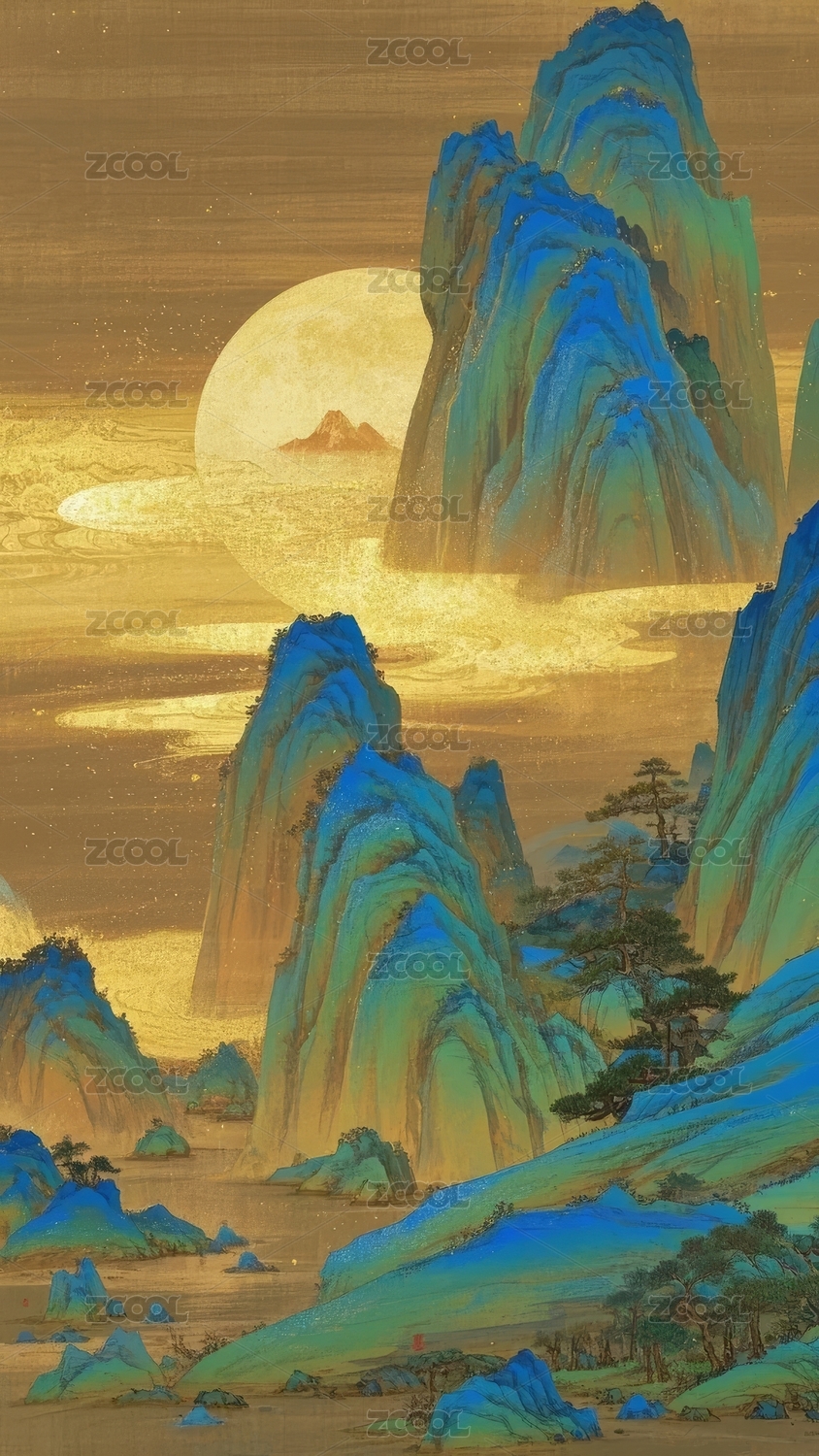 山水国风月夜装饰画背景
