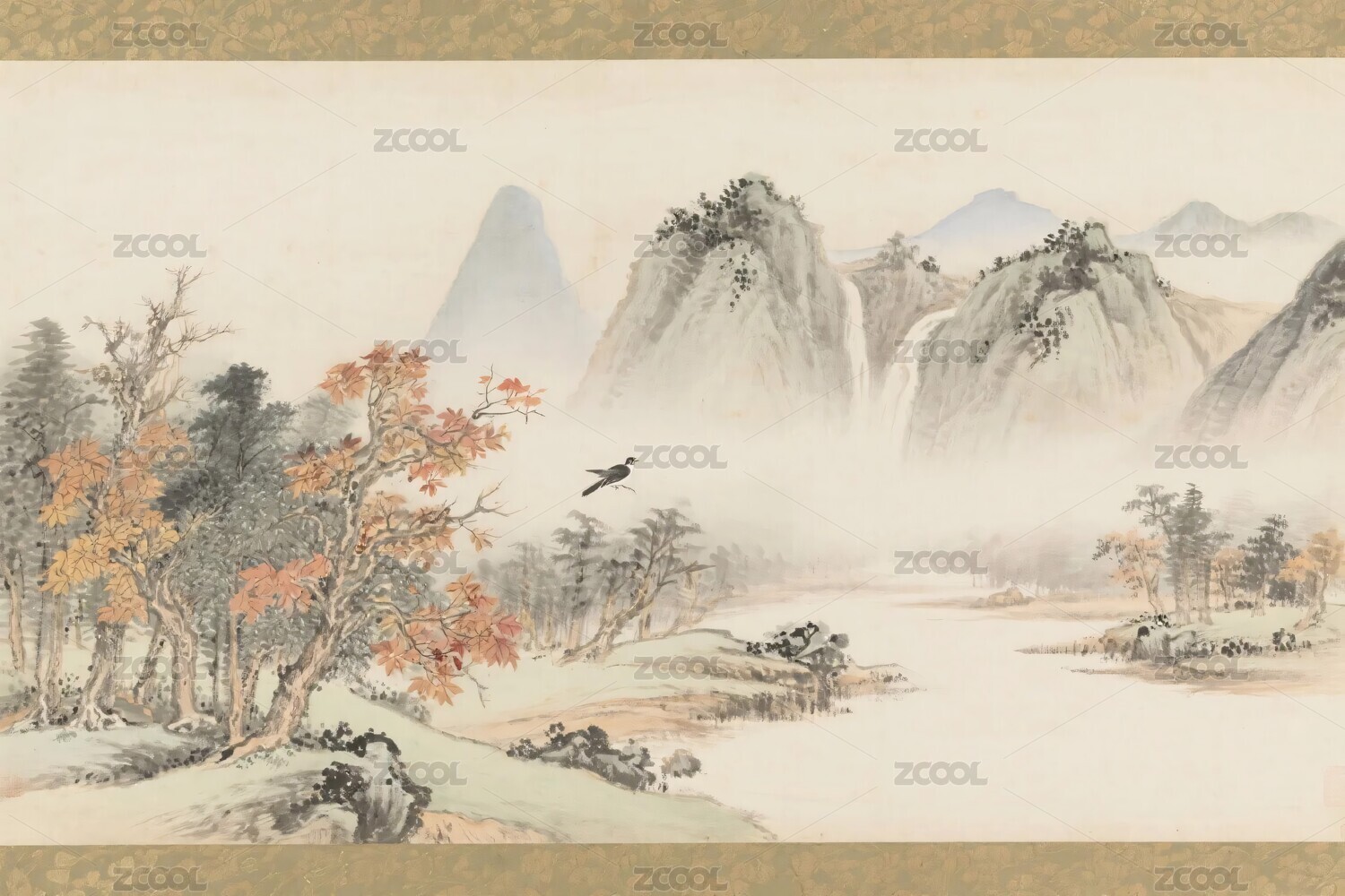 山水画,水墨画,山水,树木,云雾,瀑布,国画,古风,插画,中式